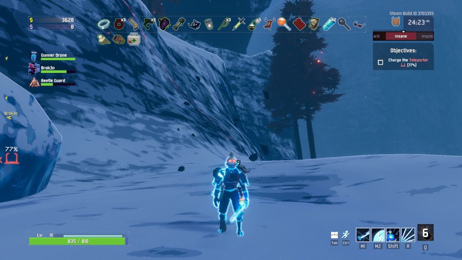 You and up to three other friends begin the game in a drop pod falling towards an unknown planet and you begin to fight monsters immediately for gold to open up crates, pray to shrines and open lockers for items. There are shrines to spawn more enemies to fight so more gold can be made, the “shrine of the mountain” that spawns an additional boss when the teleporter is triggered, a shrine that takes health and in returns grants gold and a shrine that randomizes stats. In the beginning hours of the game the shrines were definitely difficult to differentiate and I did on more than one occassion randomize my 55 minute build and then immediately lost the game. When you and all your friends are ready to leave the current level you are on, there is a teleporter that spawns a boss that you have to confront before leaving the level. You beat the big baddy and then rinse and repeat until you and everyone else has died. There is no end game for now, but this is the process of playing the game because of its Early Access.