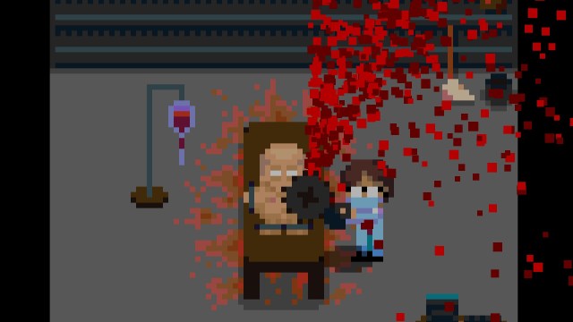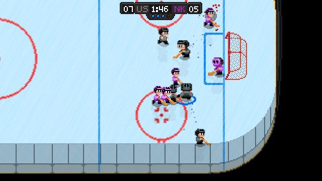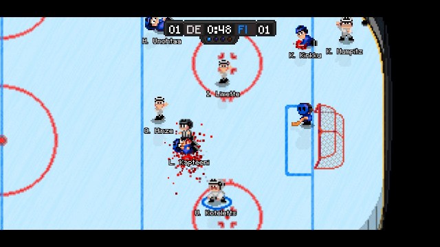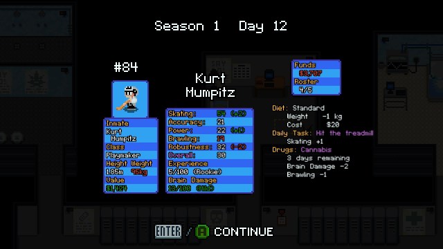 In between trying to figure out how to treat your players, you have to participate in games that reward you with cash prizes so that you can feed, pay rent, purchase more players and buy drugs for your players. Teams of five enter the rink, the puck drops and it is an actually brilliant free-for-all (for the most part). You control one of the four players (not the goalie) and you essentially just play hockey for four, three minute periods. Pass, skate, pass and take shots until the puck skates by the goalie for one of those sweet, sweet goals. The goals are the most rewarding next to mid-maxing your players that the game can offer. While playing, to many checks can result in some of the bloodiest fights in a game that I have ever been a part of. Fight’s pit each team against each other and whatever comes out losing has a player suffering a debilitating or even a fatal injury. Injuries impact the player after the game has concluded and if it is debilitating enough, that player can be set to the infirmary. Players who enter the infirmary require upkeep and upkeep is expensive when money is tight. You can either hold onto a friend or pull the plug to save money for a replacement. I had a franchised that ended when two of my players got their asses destroyed and entered the infirmary after the game, one died on the ice and I did not have enough money to keep them alive. I was essentially forced to start a new franchise.