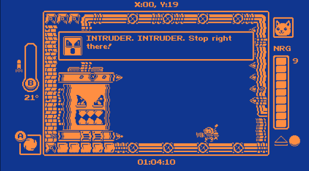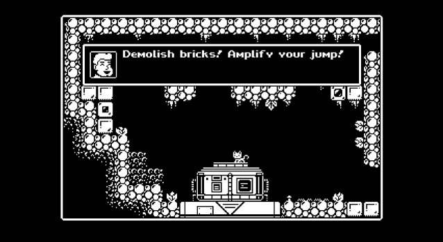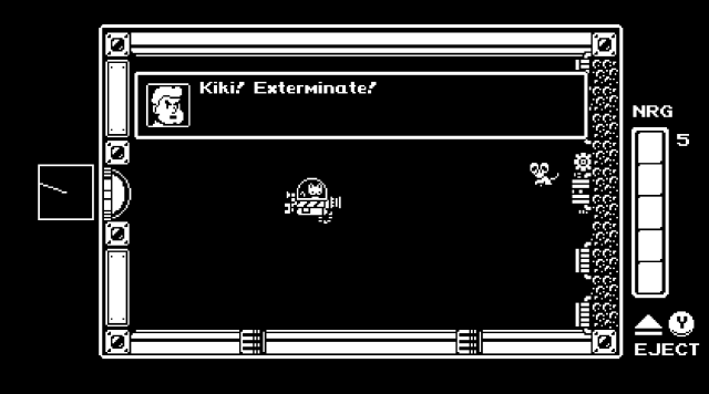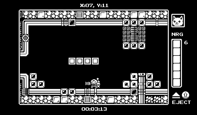 Kiki can jump and run up walls, but when Kiki is in a mech suit the game changes. In the beginning, the adorable cat has only a pea shooter but while you adventure through the planet you can acquire upgrades. From health modules, rockets, a double jump to a dash, Kiki quickly becomes a force to be reckoned with, destroying all enemies in its wake. Kiki, throughout the game is not restrained to just a mech suit, there is a cute little submarine and gun placements that the feline can man. The UI when Kiki is inside these instruments of destruction are the best feeling that Gato Roboto can offer. Kiki’s head bounces, mouth smiles and get serious all the while enemies are being murdered.