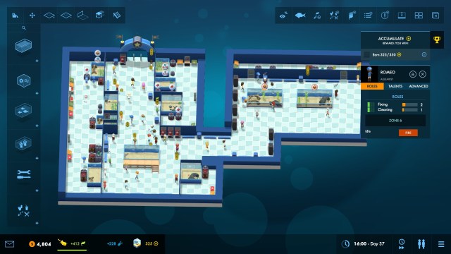 Aquatic life is not the only aspect that needs to be managed. Staff are hired to help the player with the day-to-day feeding, cleaning, fixing, gift shopping and the talks around the aquarium. In time the staff does level up and it is up to the player to choose what point goes where. The more points that are put into a specific skill, the more efficient that staff is in that skill. It really helps when the game throws more complex feeding regimens and repairs (that will take more time for those who are not adept at a certain skill).