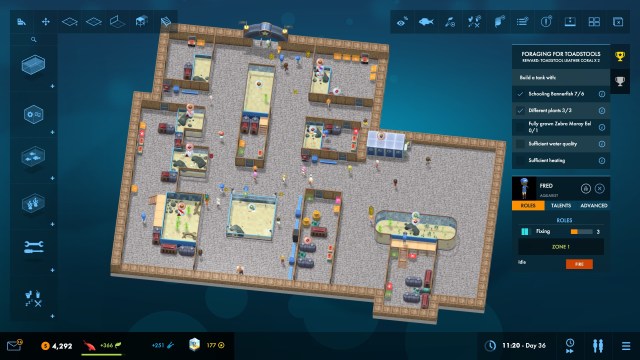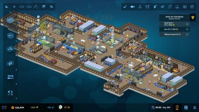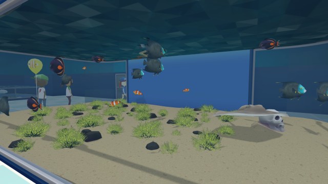 Mega Aquarium‘s story mode introduces to the player, over the course of ten scenarios, all the cogs and gears that allow an aquarium to function. Each scenario demands that the player achieve a certain amount of prestige points to “win.” Prestige points are earned when patrons enter and experience what the player has created. Points can be achieved through the aquatic life exhibits, decorations around the aquarium, and just about everything else.