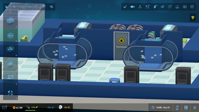 Everything that the player needs to create their aquatic masterpiece is on the left side of the screen. Each section is labeled to make navigating easy. Engineering is where heaters, chillers, and other machinery are located, Fish is where (you guessed it) the aquatic life are, tanks are where the fish tanks are etc. Each species has a group of symbols related to them and when you hover over them it reiterates what information the players needs to know. For instance: a thermometer that is blue refers you to remember that the fish belongs in cold water, whereas, red points you towards using a heater. Fish that are hostile towards other species will have an exclamation point and it will inform you of what the fish dislikes. All of this takes time to digest but it does get a tad bit easier when the later levels come along. From building tanks to bathrooms, decorations and fish food, Twice Circled made the UI incredibly easy to navigate.