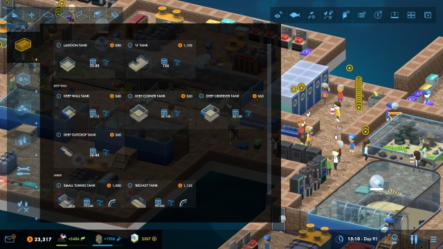 The difficulty in the later levels when prestige is not the only criteria to win. One level requires the player to rank up and house five different species of shark, while another requires that the player earn prestige while housing twenty-one different species. Each scenario requires the player to focus on constructing an aquarium that reflects the needs of the patrons. Patrons are the most fickle. Make the aquarium too big? Patrons will not be able to navigate it, become bored then ultimately leave with your prestige points on the downward spiral. Not enough food and beverage stations? Complaints. Not enough benches and waste bins? Complaints and trash all over the aquarium.