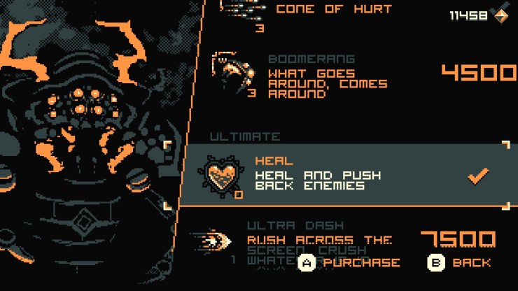 The game awards you with gems that can be redeemed at any of the four stores within each section of the campaign. You buy slots for energy that you can spend on extra jumps, a longer dash, extra health points, an ability that makes enemies explode on death, an ability that protects you longer after you have gotten hurt and a plethora of other options that widen the range of ways to play the game and still have loads of fun.