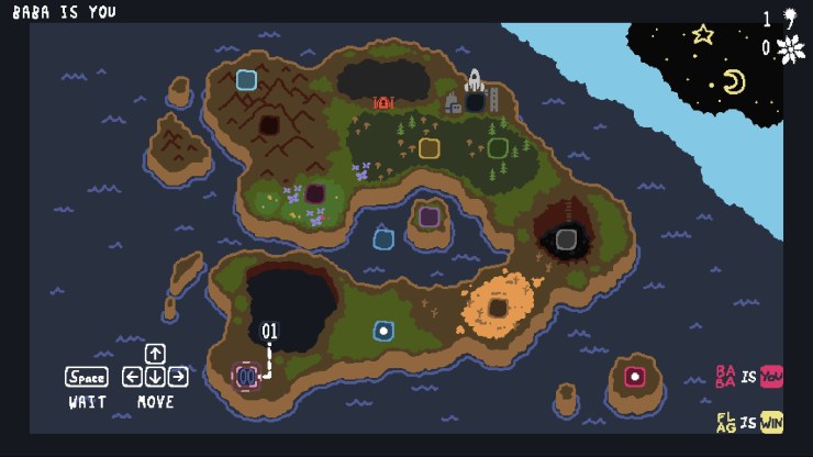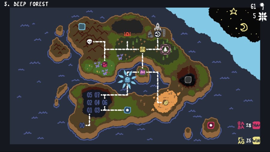 Baba is You contains nine different sections to explore and solve puzzles in. A lake, forest, a garden and a rocket ship are a few of the sections and with with each new section are new mechanics, nouns and properties to make the game even more difficult than the previous section.