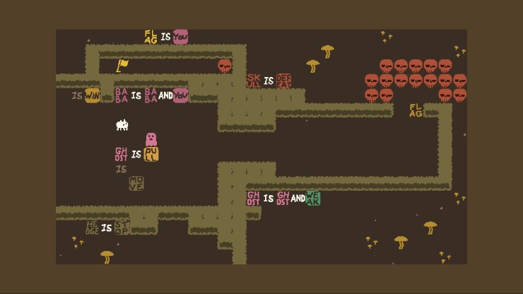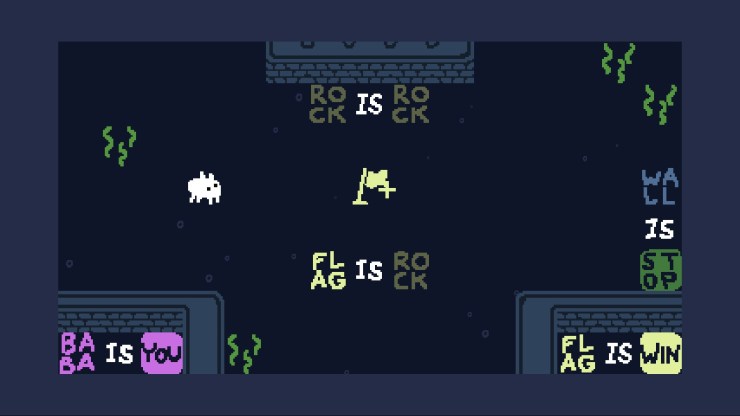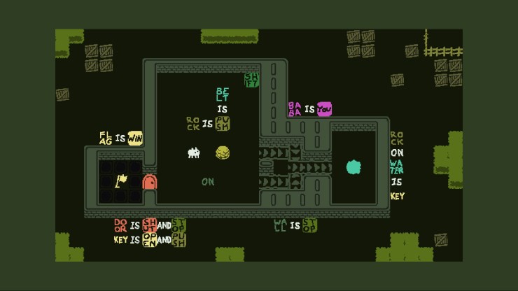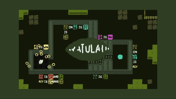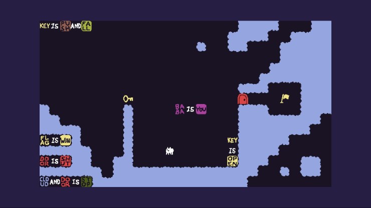 There is no plot to this game as far as I could tell. You are Baba, an animal that can break the rules and do whatever the hell it wants. There are usually a noun like Key, Baba or Wall and properties like PUSH, PULL, MELT, etc. The player can align Rock is Push and now the player can move the rock, but if that phrases is not connected then Baba cannot move the rock and the same goes for every object in the game. All of these can be interchanged for the player to succeed in their goal of winning.