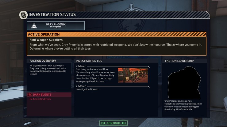 The Progeny is group of psionics that ideology envisions a world of psions. They abduct civilians and convert them to thrall for their revolution. Gray Pheonix is a group of individuals that consist of a wide array of races that abduct skilled engineers in hopes of obtaining and fixing vehicles to return to their home worlds. Sacred Coil is a religious movement that consists of ex-Advent personnel and species that were part of the invasion of Earth in previous games. They recruit masses by claiming to have a cure for a disease that ravages hybrids. Each faction has their own investigation that has its own specific missions that culminate a very cohesive intent and end game.