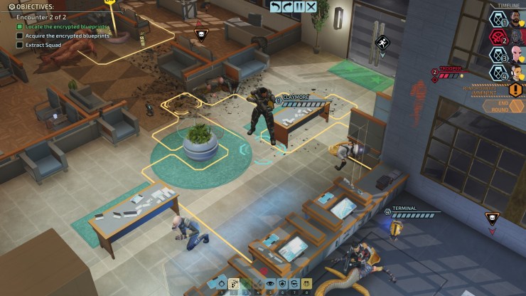 Game play is not too much different of that of previous XCOM games. The only exception is that of Breaches. Breaches are moments that the player positions squad mates at entry points into the next area with either a positive or negative buff attached. The number of enemies in the viewable breach point and the chances of danger are also present to allow players to determine if it is worth it to place an agent at an area to risk damage. After the player has chosen a entry point for each agent, the agents blow the door and are granted with a pre-game turn to slay a few enemies and obtain knowledge about the area and enemies. Breaching adds a small amount of strategy to the game; it allows the player to take note of how many enemies there are and of what type so that they can plan ahead.