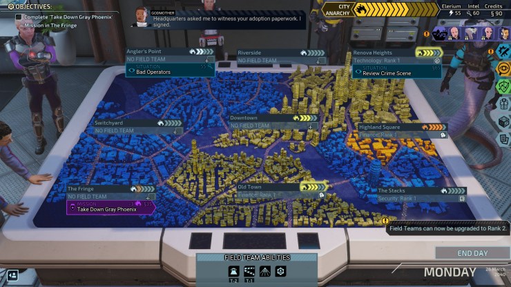 The map of City 31 is at the forefront of the game. It shows all of the activities the player can do while they are waiting for main missions to to crop up. Some missions may be just scouting missions that end the day automatically, some missions are not as urgent and allow the player to choose the mission that’s rewards suit their needs. Missions that are critical need to be done that day and that day only. Field teams are introduced to allow the player to add extra intel, elerium and credits in the background.