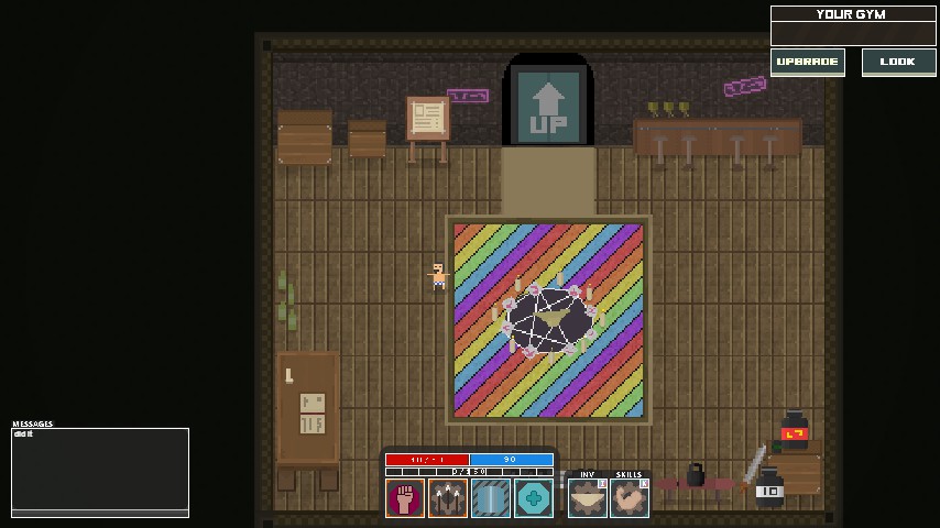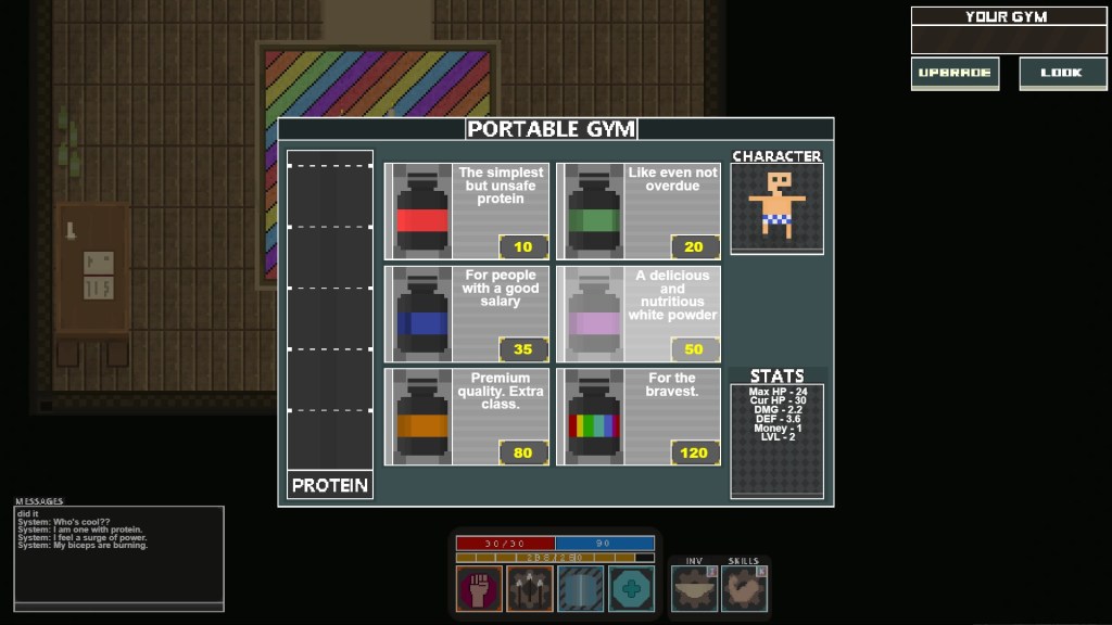 Not gonna talk long about this game because I could not finish it AND I just didn’t like it. Deep Dungeon Gym is a game about you trying to create the best gym through fisticuffs. You can upgrade your gym through points, that I was not able to view, and buy dumb shit like protein that I still have no idea the practicality of. The actual game play consists of a five level procedural dungeon that ends with the big bad guy. The plyaer can level up and get some sweet passives and new attacks but they don’t actually matter.