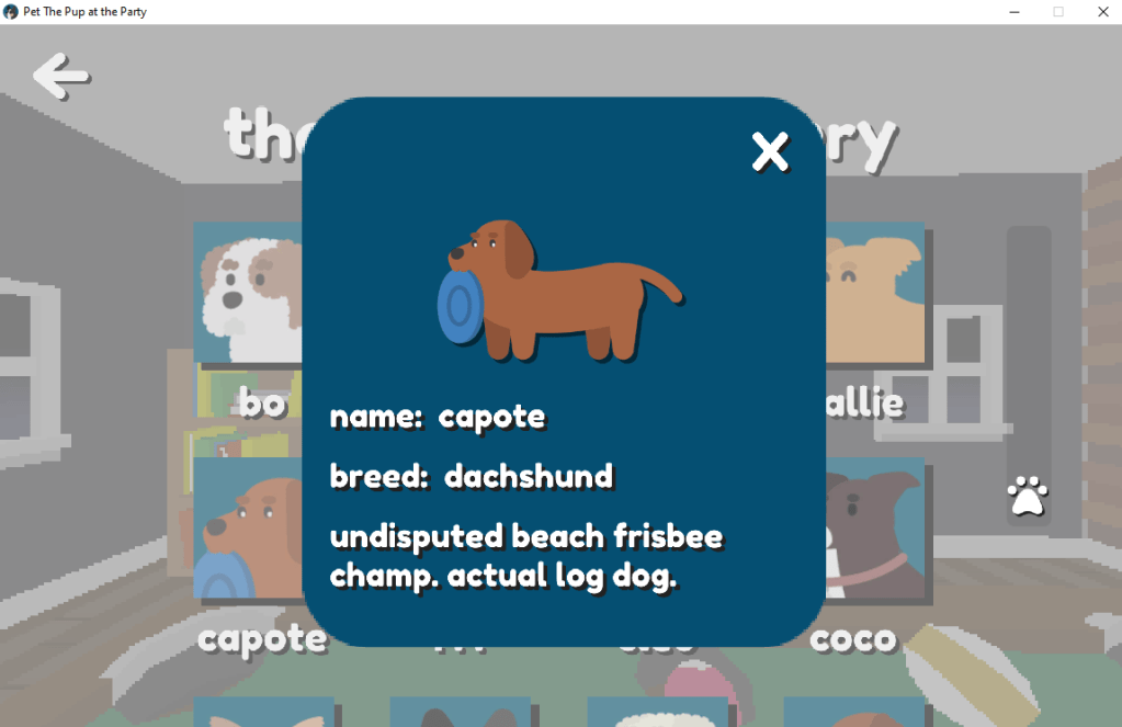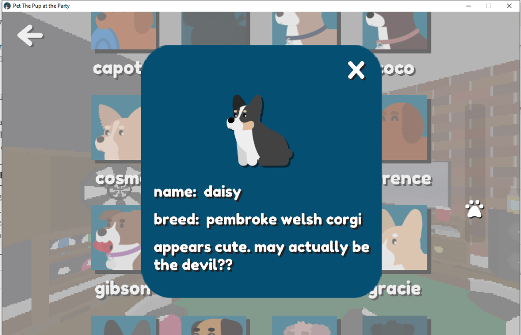 This is all the game sets out to tell you: You are at a house party, you don’t know anyone BUT! there is a legend that tells of a VERY GOOD PUPPO hiding somewhere in the house. The clock is ticking and you’re running out of small talk, can you find it?