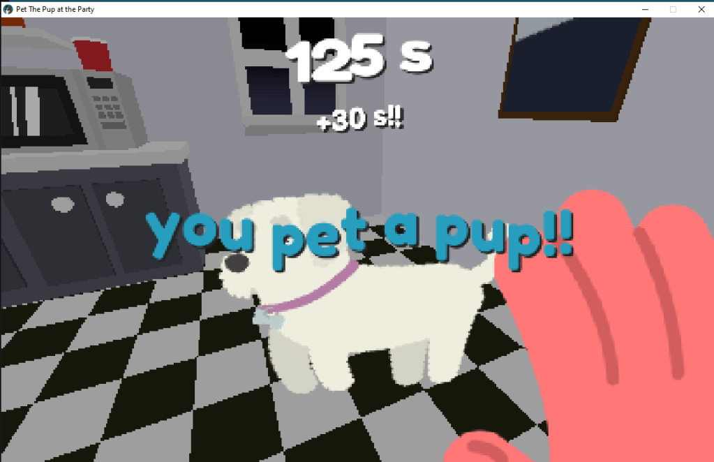 Starting with 120 seconds on the clock, WASD moves and left-mouse opens doors, you begin to walk a labyrinth that is filled with partying people, bathrooms, closets and the eventual pup. The questions that came up early was, how do I find the pup? Well the pup every once and a while arfs! that is visible to the player to give a navigational hint. When you find the pup, you give it the best pet in the world and the game congratulates you and gives you + 30 seconds on the clock and you go AGAIN.