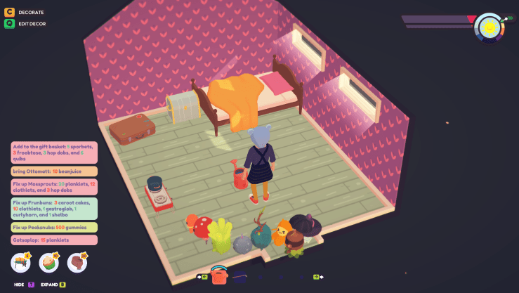 Use the tool to shape the soil to plant veggies and Ooblet seeds. Both take a certain amount of time to grow. Seeds can be bought at the market with gummies, or the towns currency. Don’t forget to water the plants or they will wilt. Clearing weeds, rocks and branches help with the situation of expanding your farm. Rinse and repeat until your stamina depletes and then it is time for bed.