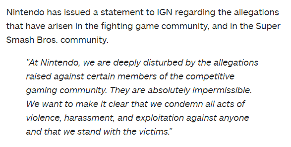 Updated on July 28th, IGN interviewed Nintendo about the allegations that were stirring inside the Smash community and they responded with MORE distancing from the competitive scene. Their statement was as followed: