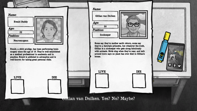 Just like every 9-5 job, Grim awakes, gets dressed and gets into the elevator that takes him to his desk. At the desk, identification papers churns out magically and its off to work. There is always a note from Fate or his cat instructing you on how many people must die and further requirements, if any. There is a tiny bit of investigation required as you look at the humans and decide their fate. Sometimes there are tricks, I.E killing the shitty zookeeper allows the animals to escape and kill more people. It may be a feel bad but sometimes death is double-edged sword. Sometimes you can’t avoid a shitty scenario.