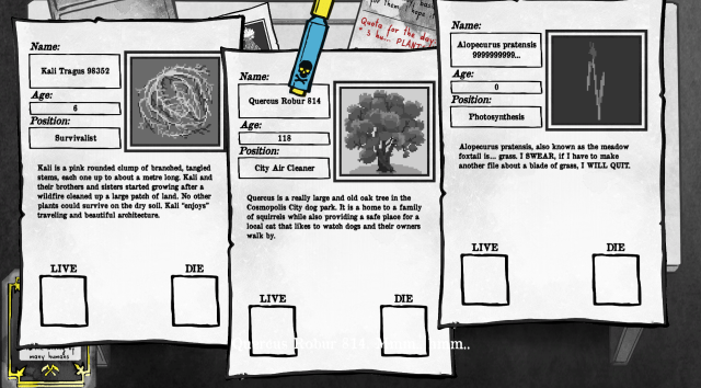 You are the Grim Reaper and you are an office worker. Instead of walking around reaping those whose time has come, you are tied to a desk with the lives of humans summed up very nicely on a piece of paper. The big boss man, Fate, is concerned only with following the rules and explaining to you the purpose of humans. The fate of world is in your hands as you navigate up and above middle management to become the Grim Reaper the world perceives you to be.
