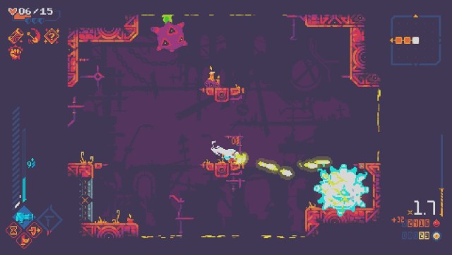 Rooms are small and are usually filled to the brim with enemies that attack within seconds of spawning, so begins the dance of death. It is a complete joy to never touch the fucking ground in a room. Kyhra is also equipped with a little robot friend that can also be used as an aid in battle. The bot is quite helpful for control of the rooms with a plethora of enemies.