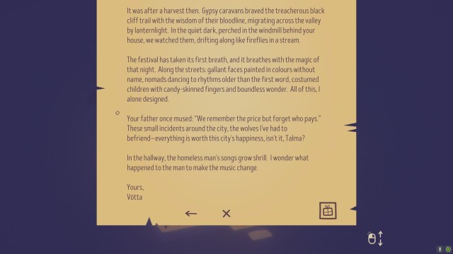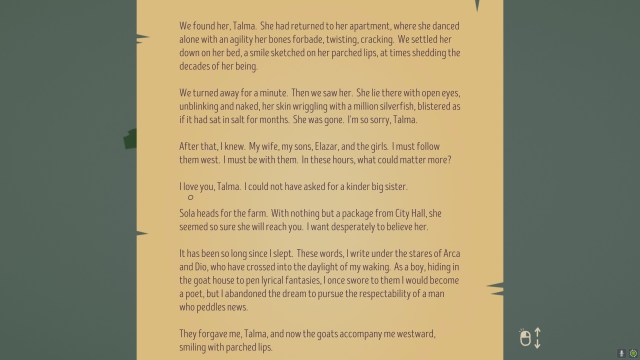 What is loneliness? Why does death always come to the forefront of the mind when you are alone with your own thoughts? These questions are incorporated when you take the role of an older woman named Talma and her everyday life within an area that is devoid of any inhabitants in the ruins of a used-to-be bustling area. It is only Talma, her goats, chickens a cat (that I did not know existed until the second playthrough) and a mailman that delivers news of the outside world, where the rest of her family lives. The day consists of enough time to do a few tasks, eat, read and then fall asleep for another day of repetitious work.
