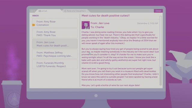 The game wanted to dedicate to informing the players, through Chalrie’s emails, the importance of death in other cultures and with that the innovations in death preservation, like green caskets, they are better for the planet and they are in fact cheaper than most options.