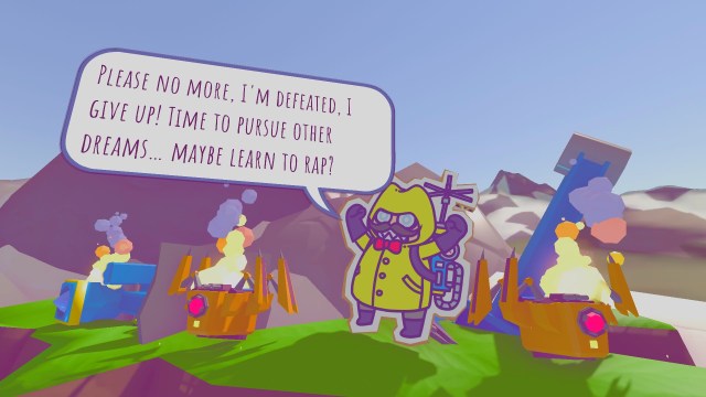 The game announces somewhere around the middle that you can’t really hurt these people because A. they are made of yarn and B. it would shoot the rating up and that was never going to be an option, so what I am trying to say is that the game looks good when it wants to but on closer inspection, it looks like poop. Humans have dots for eyes and mouths (?). Humans are only discernible because there is really nothing else on screen at the same time.
