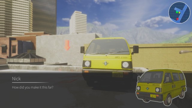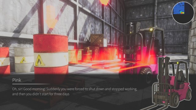You were created by humans, but now all the humans are gone and it is up to the job of the first AI forklift ever created to find out why. You travel a small world with vehicle npcs, who talk and have dialouge boxes, and do tasks for them (more along the lines of fetching fuel for them) and then you somehow end up at the final mission. There is real no story progression unless you go out of your way to find the developer logs scattered throughout the city.