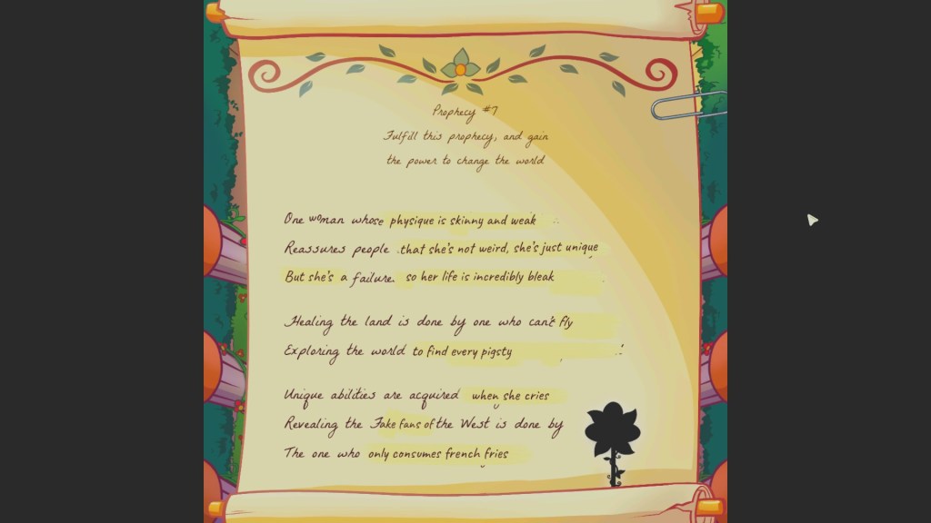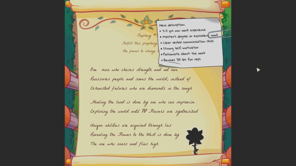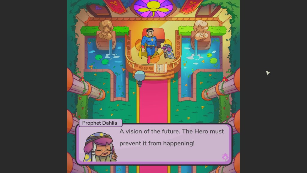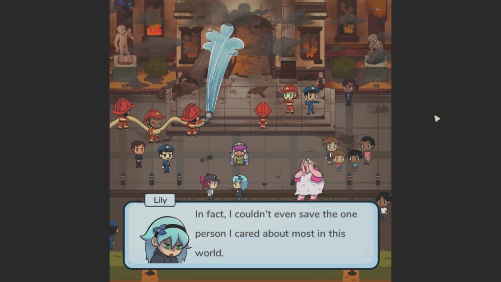 Because the game starts off in an area that is mostly out of context, the story can be pieced together. You control Lily, a girl with an immense amount of hopelessness and the power to rearrange objects. The demo starts with Lily being dropped off at a museum to see a hero named Superb Man. Superb Man is supposed to be the catalyst of change for Lily but it is cut short. Lily has a fight with a woman named Rose and falls into a painting. She stumbles upon a scroll that foretells the emergence of a hero that will stop some evil.