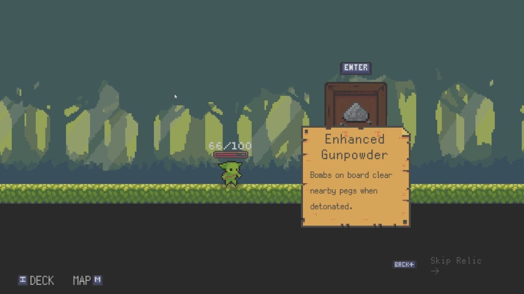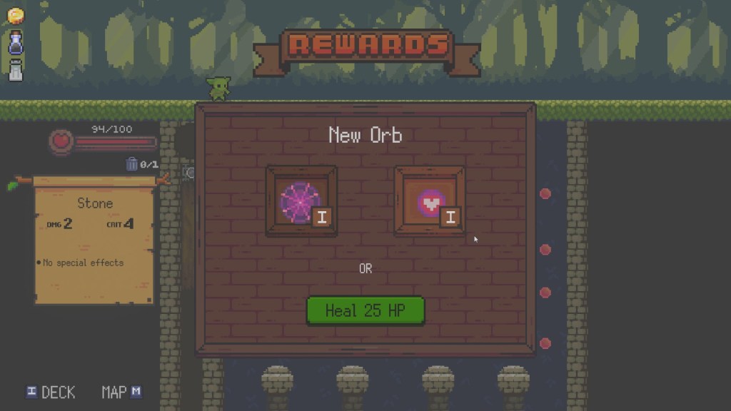 There are also passive items that can be obtained through the “choose your adventure” option. Reach your hand into a bramble thick tree? Well lose HP and gain a bramble stone. Persevere or rest? Peglin has choices that can either reward or punish.