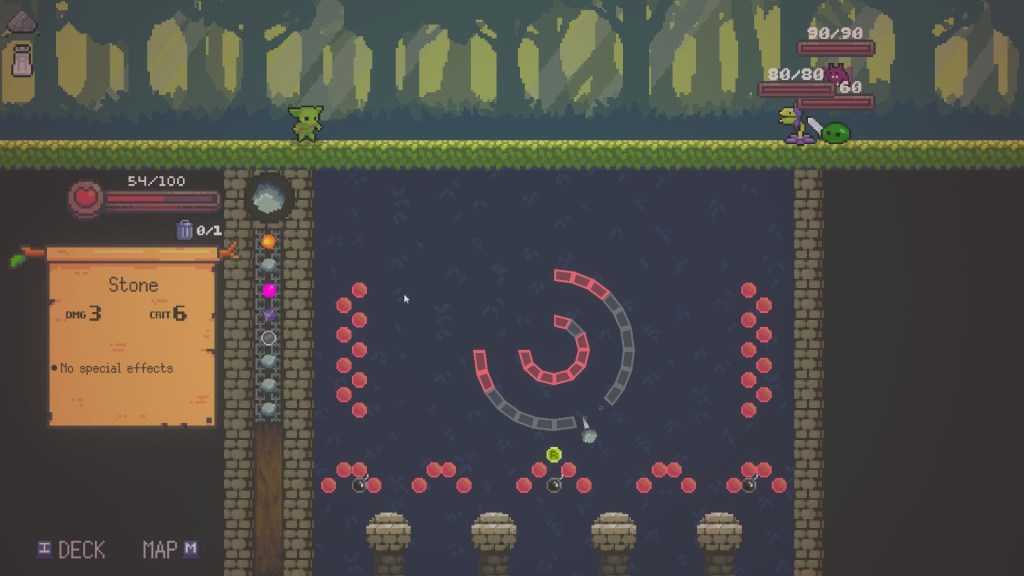 Combat is as follows: procedurally generated pegs (with an included Crit and Refresh peg) account for damage when hit with stones. Peglin’s stone is at the top and the player chooses the arc for the stone and then lets gravity do its thing. The stone hits pegs and racks up damage until it disappears into the void. Enemies surge forward and repeat until either Peglin or the bad guys perish.