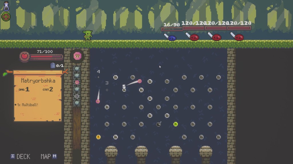 There are more than just your basic dagger stone. Stones that resemble Russian nesting dolls, fire stones, electric stone, and even a regular stone fill Peglin’s “deck” per se. You get to choose what stones Peglin uses and, when completing an area are allowed to choose between HP or a stone upgrade. Each stone has damage and a critical stat multiplier that is relatively important when facing a big monster.
