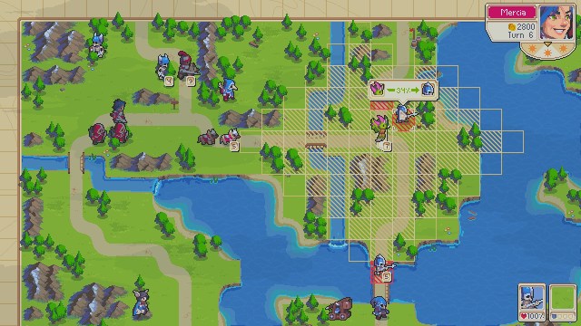 The game looks great, especially the opening cut-scene. It is always pixel graphics that get me because you can make really good-looking games with the style and Wargroove is definitely one of those games. The forests are lush green, and the water flows with nice shades of blue.