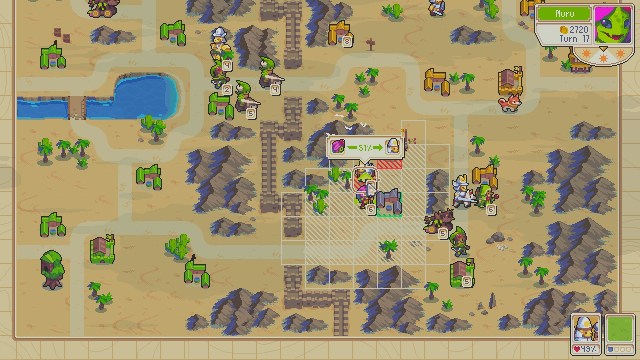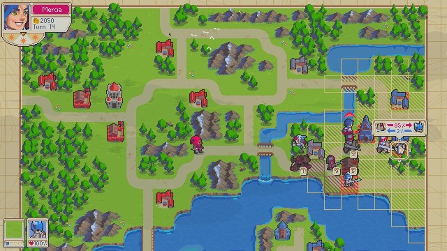 The gameplay is just Advanced Wars, that’s it. You have a map, you have units that can move a set distance and when you get close to an enemy unit, you get a percentage of damage that will be done, and then comes the good old Advanced Wars fight animation. Units run upon their respective side and then the small skirmish begins.