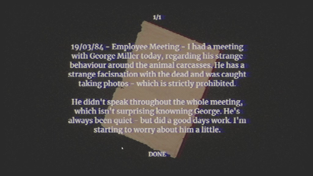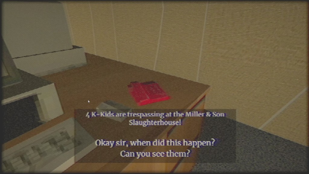 The game that I played I guess was a prologue to what will be the full game. I played, for only a few moments, a person at dispatch who gets a call about a group of kids entering the “Miller Slaughterhouse.” Then you take the role of a police officer who is dispatched to investigate the slaughterhouse. Once you enter it is very clear that there is some freak that lives in the slaughterhouse who also likes to murder people.