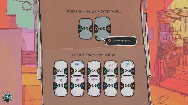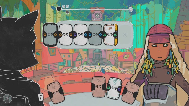 Conversations are the true backbone of Signs of the Sojourner as it is the only true mechanic in the game. Conversations start with a character having two symbols next to their character indicating the type of conversationalist they are, either it being logical, direct, grief, etc. Each card has a symbol on the left and right side and when conversing, they need to match the symbols being played by the NPC. Note that if you cannot match the symbols with the NPC there is a chance that the conversation will fail and there will be a less than favorable outcome, but when succeeding it rewards you with items to sell at the store and unearth more information about your mother and her past.