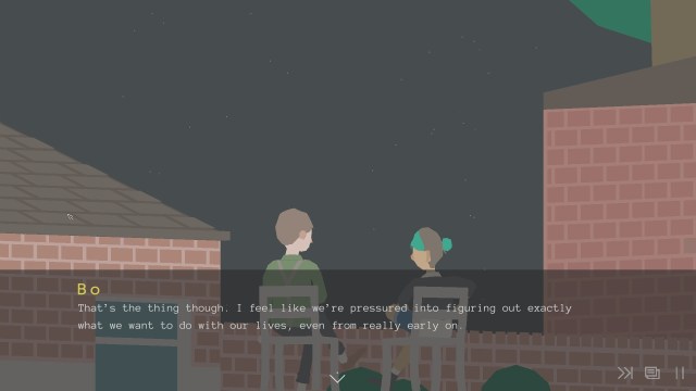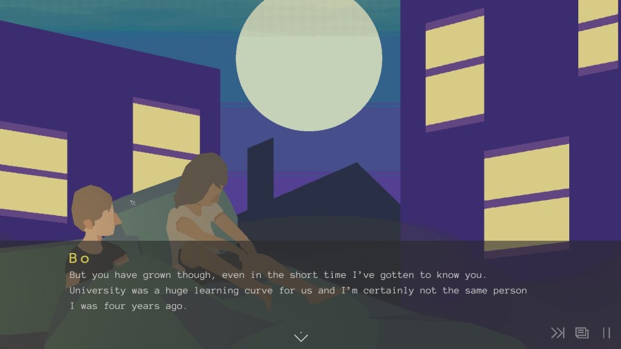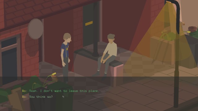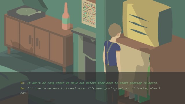 No Longer Home features an isometric view of the university flat. As you walk from room to room, markers are given to the player to interact with, either it is a conversation or a memory of an object. The story doesn’t necessarily devouts itself to one character, it often branches between the two main characters at seemingly random moments. It works, honestly, it had confused me at first, but when I started to pay attention, the split in conversations really drew me in.