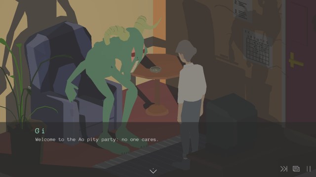Sometimes I really hate playing games. Only because I get stuck in ruts where I only play the same genre over and over and over. I found myself playing a lot of platformers lately and before that was roguelikes. In lieu of that, I decided to change pace and play a NARRATIVE DRIVEN VIDEO GAME. This week I am forced to say goodbye to uni friends and with that, the demons that also live in the flat. This week I played No Longer Home.