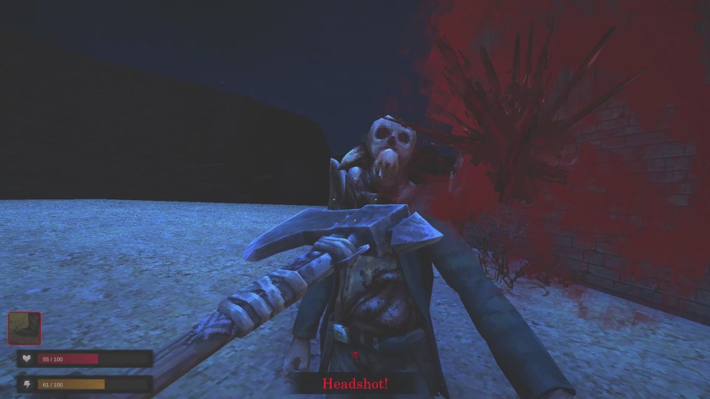 The player has a health and stamina bar. Stamina is consumed when running and swinging melee weapons. Health does not regenerate and the only way to restore health is to find bottles of alcohol scattered around the map, as are ammo and other resources.