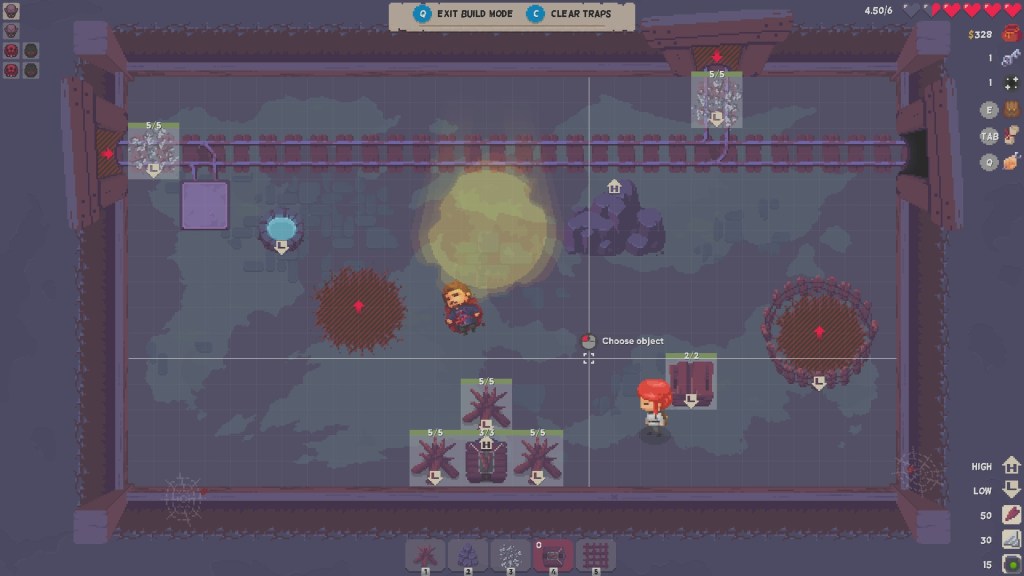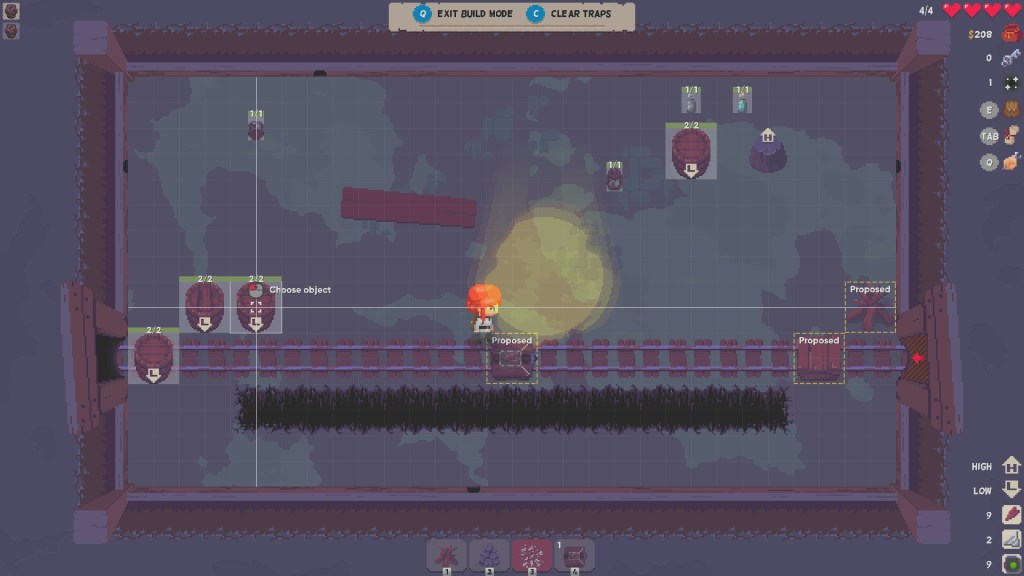 Gameplay is the typical run of the mill rouge-lite stuff. Random generated dungeon with random routes, random enemies, random resources and random shopkeeper placement. As angel travels from room to room, she can collect resources like glass, stone and wood to aid her in battle rooms. Battle rooms allow Angel to craft weapons and traps using resources to defeat the bad guys. There is no timer and Angel can take all the time she needs to craft the perfect defense, which feels pretty good. Placing towers and traps are incredibly easy here and takes little to no time at all to grasp the concept of tower defense. Enemies come out of their warrens and infest the area, they have got the good old health bar and when there is no more red, enemy dead. Upon completion of the room, Angel can disassemble the traps and quickly leave with extra gold in her pockets to spend at the shop.