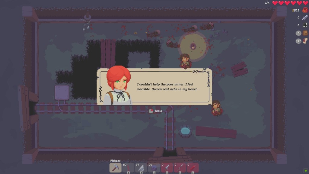 A mine has collapsed and it is up to Angel to find the remnants of the mining team and her husband. Upon entering the mine it apparent that goblins have infested the area and they want out. Probably to feast on humans or something. It is up to Angel to gather resources, build traps and get those sweet rouge-lite perks to stop the bad guys.