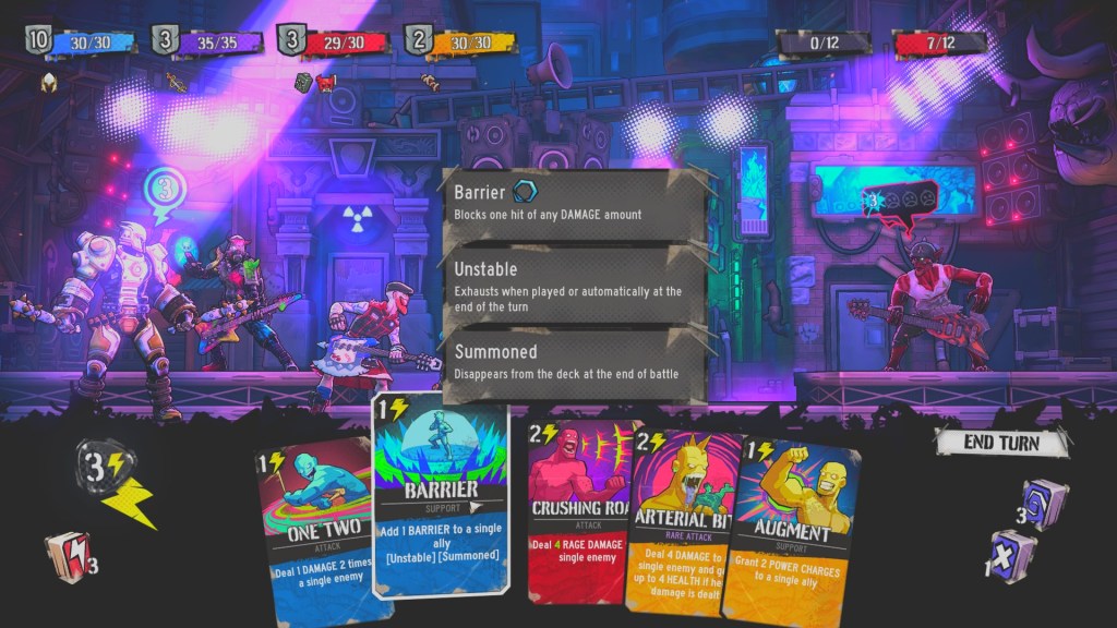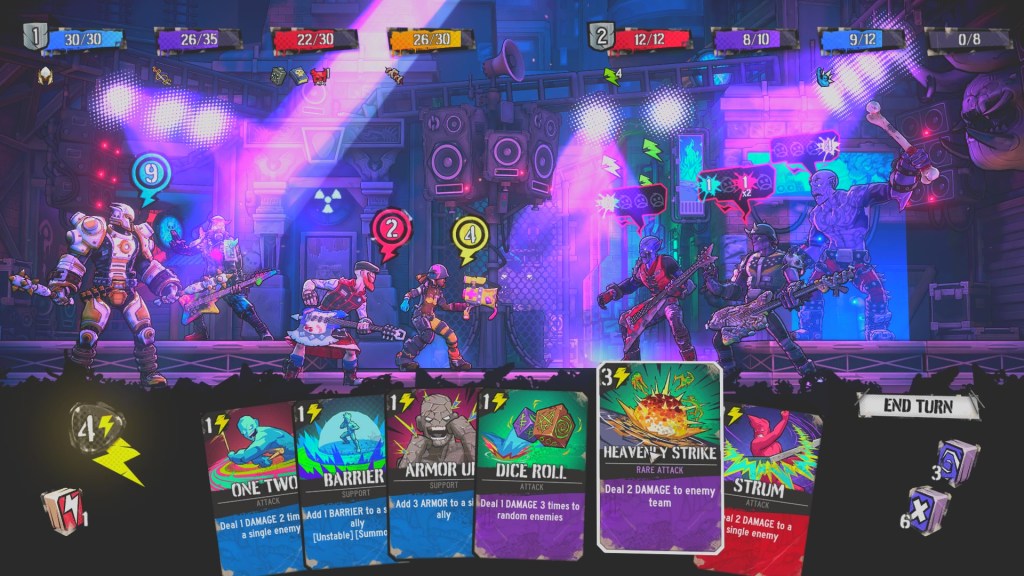 The name of the game is deckbuilding and the demo onboards pretty well. The deck consists of cards with abilities that match the band. The starting band has an aggressive member, an AOE member, a healer, and shield-er? That’s fine, I’ll go with that name. Each band member has a set of cards that match their ability and they all get shuffled into a deck. When the battle of the bands begins the player will draw essentially six cards. Throughout the demo, the amount of beats (or mana) is four and the costs of the cards are on the top left side. Choose cards until you run out of beats and it passes the turn, and the bad guys get a go.