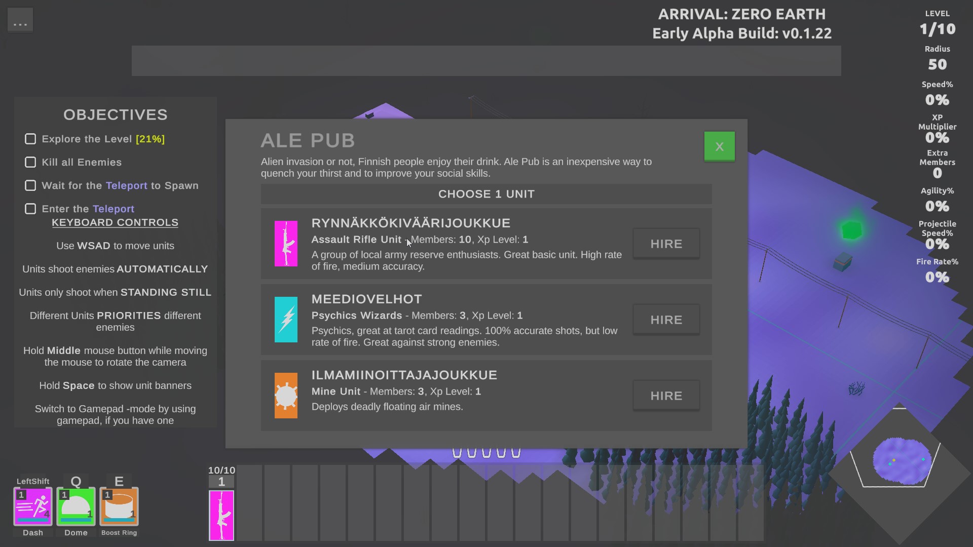 Roam the countryside for loot and power-ups, all the while fighting off waves of alien-like enemies. Again, the power ups consist of you run-of-the-mill rouge lite stuff, I.E attack speed, movement speed, and turrets that deploy while walking to name a few. Units are found primarily found in pubs and abilities are found in chests that litter the area.