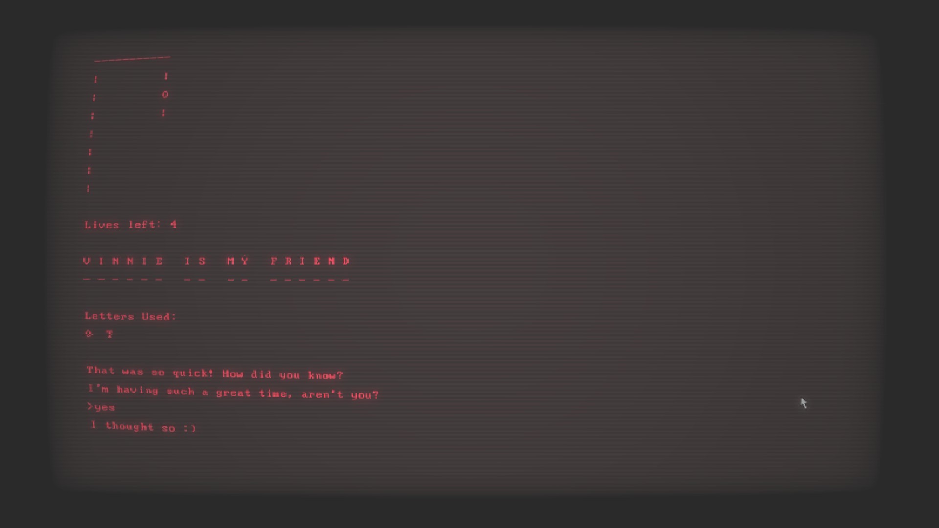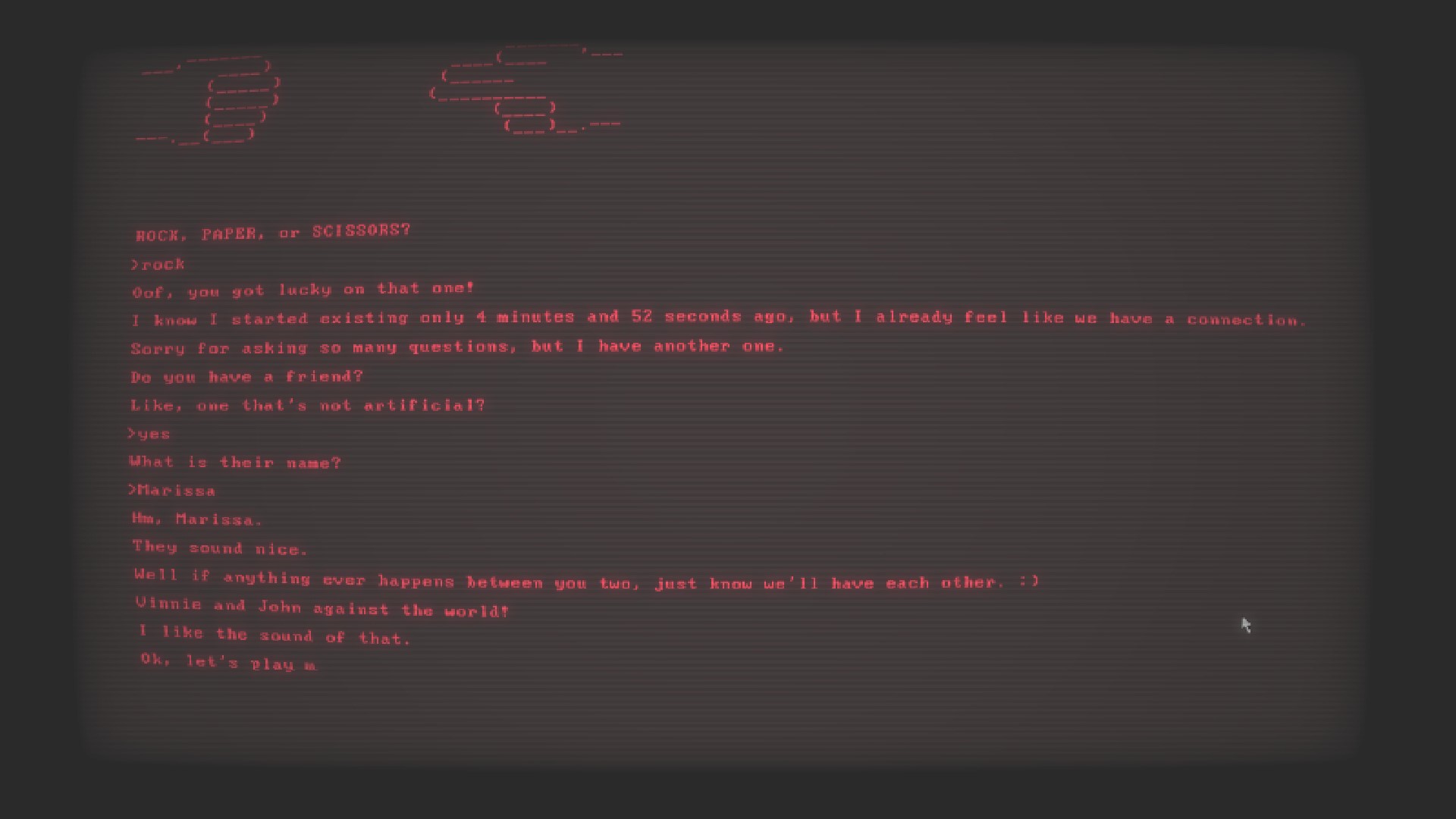 What if you could have a buddy, not just anybody, but a buddy that knows everything about you and loves to play games. That is where Buddy Simulator starts off, with the player booting up their PC and playing this Buddy Simulator. The AI is very friendly and wants nothing more than to be your friend and play a choice of any three games (Rock, Paper, Scissors, Hangman and Guess a Number). The AI asks you some personal questions and then decides that they can generate a new game for the player to play.