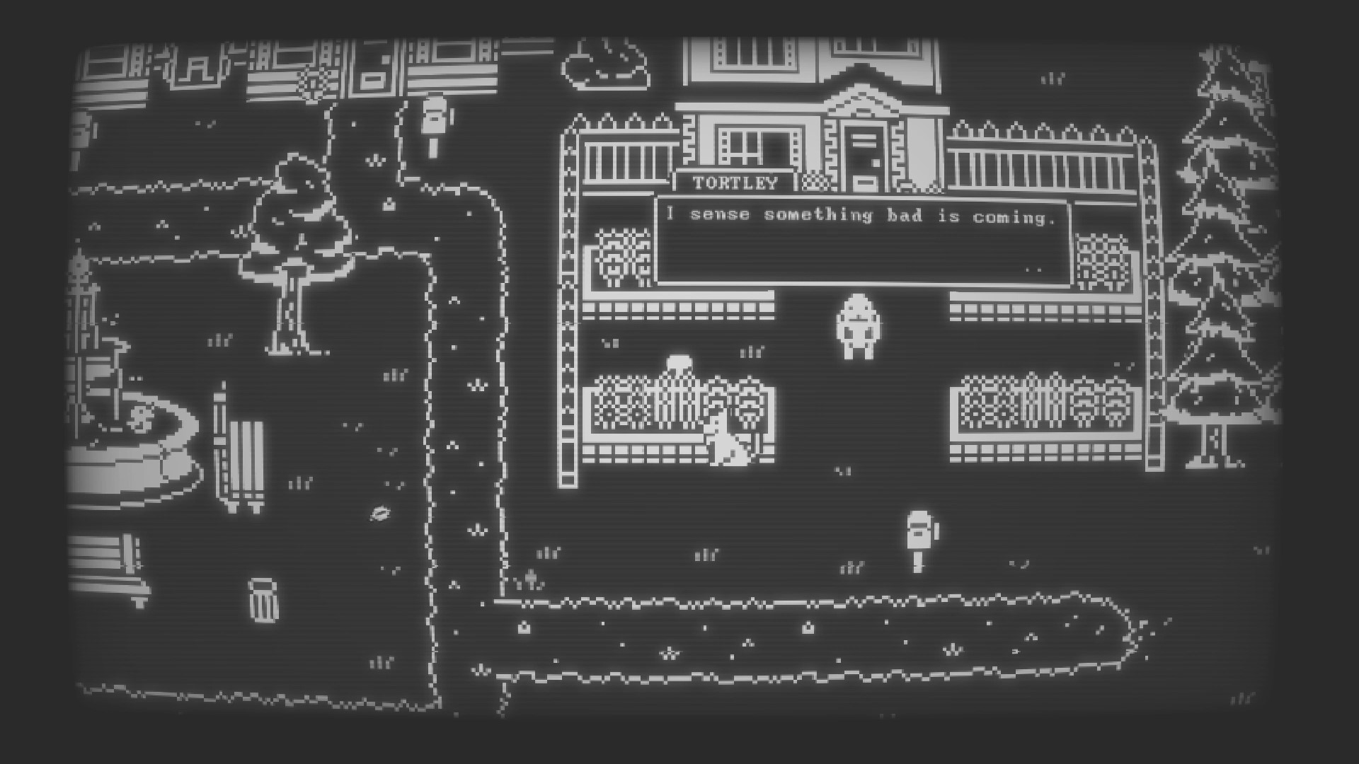 After the text adventure is complete, your AI buddy generates a home with a bed for you to sleep in. As the night passes, Buddy Simulator 1984 turns into an RPG centered around friendship. The Mayor of the town you are across the river from has been eaten by a monster and it is up to you to save the day. A story set in three acts as you befriend a small team and venture to the edges of the world, learn about the real meaning of friendship, and make countless friends along the way.
