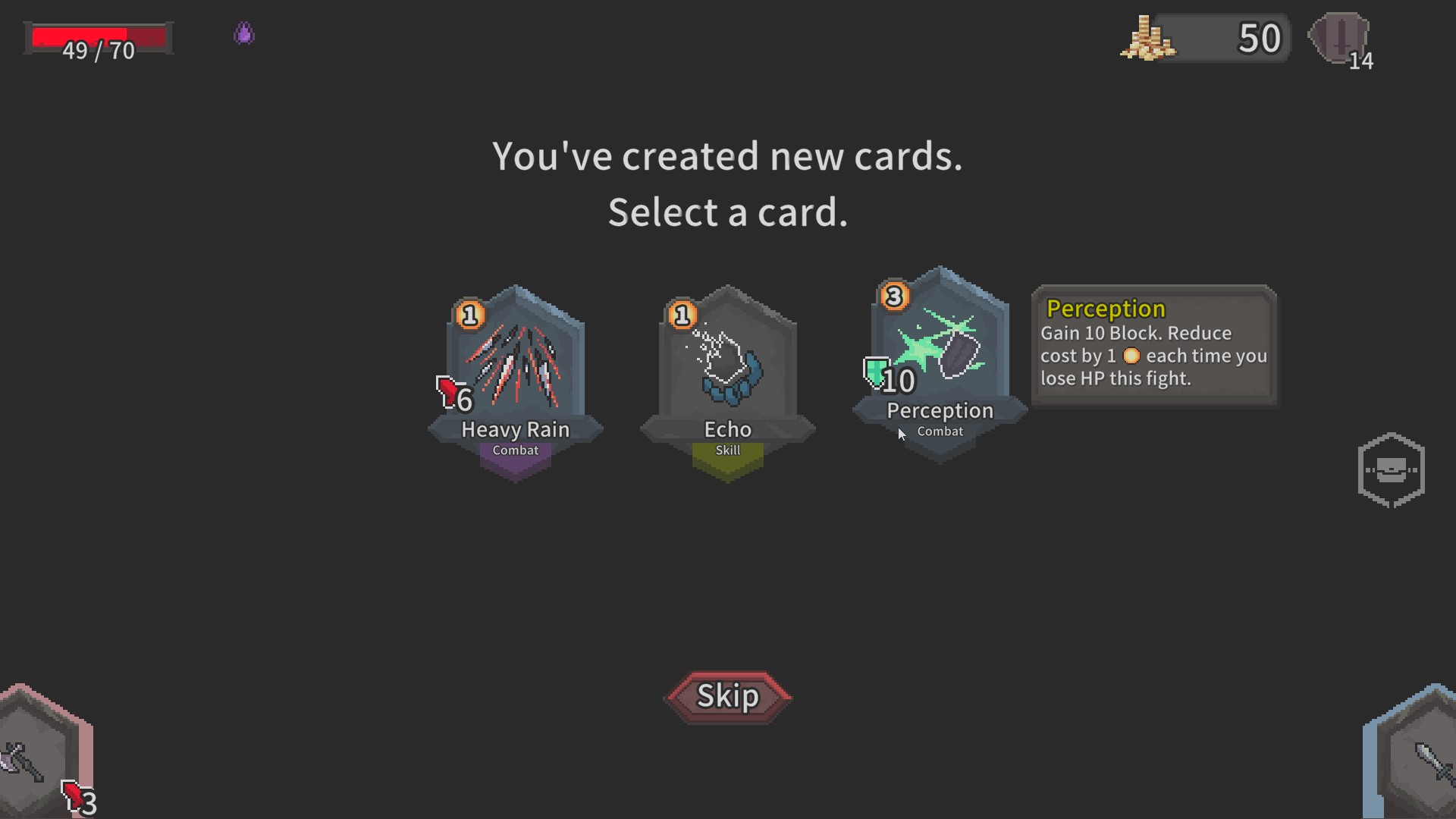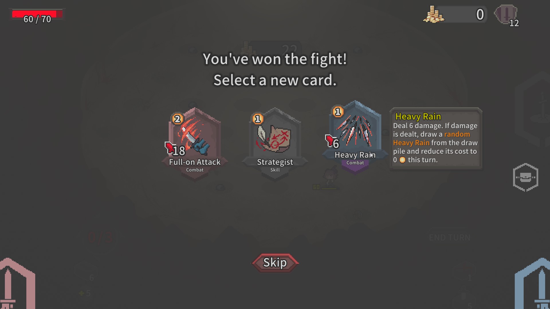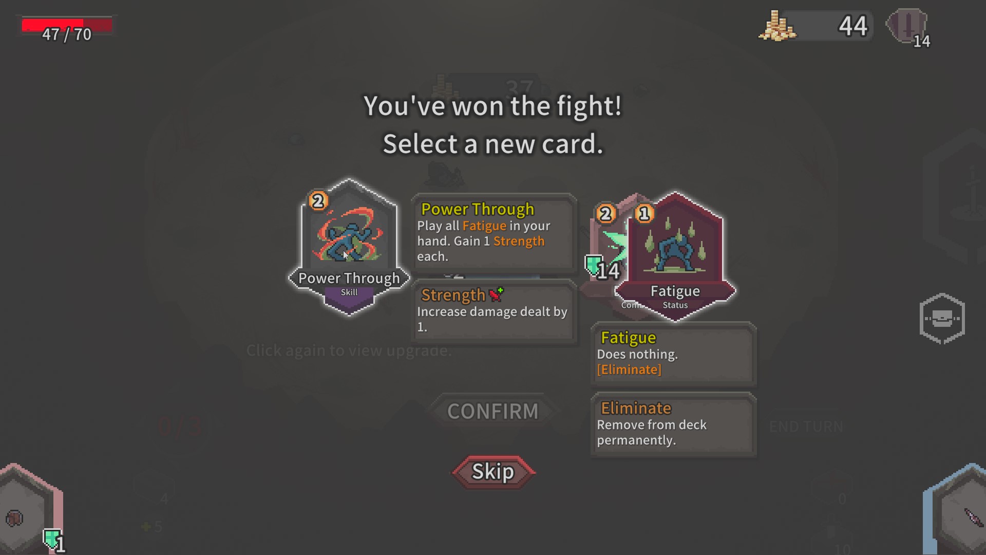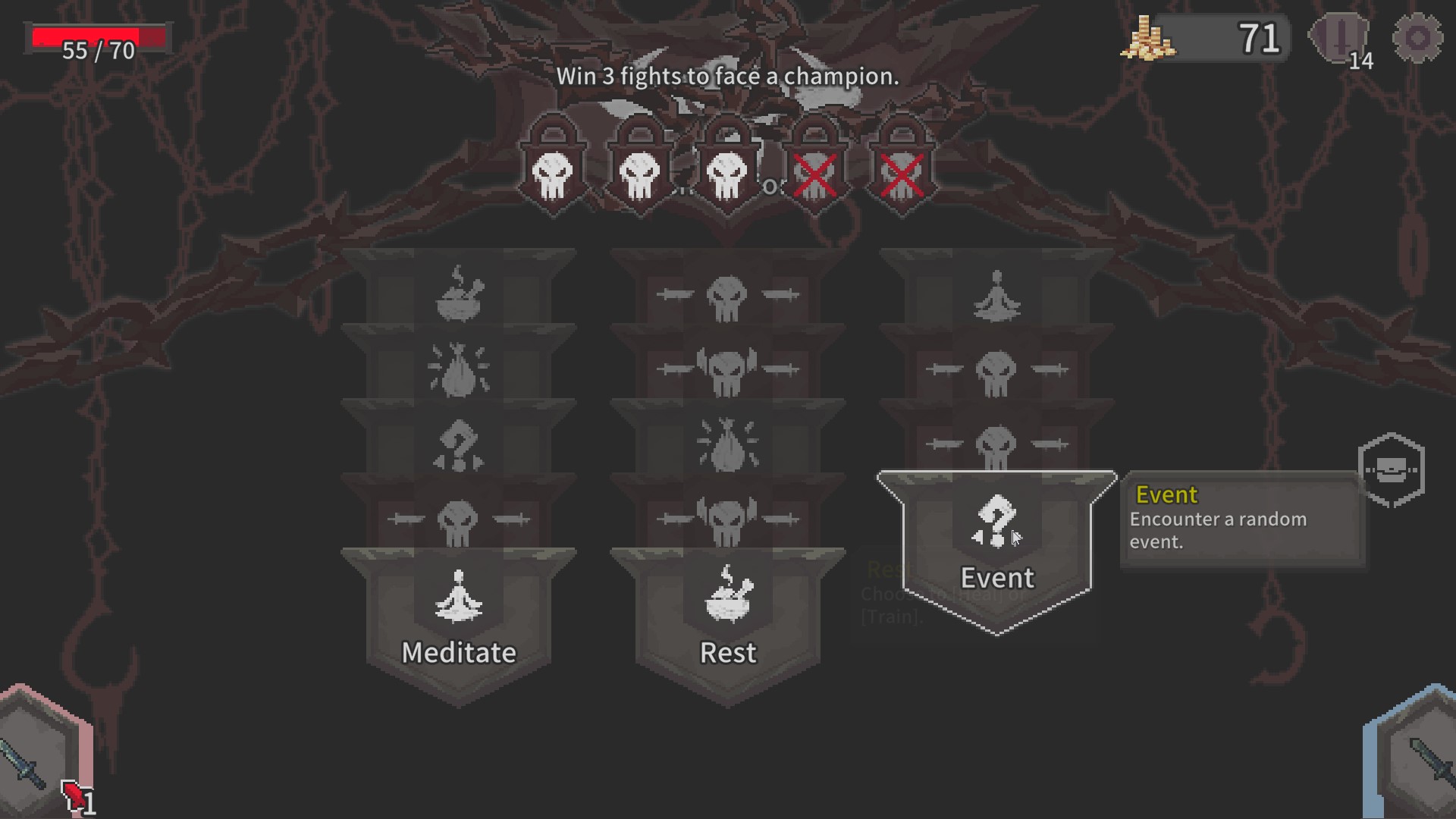 The choice is up to the player as there are three rows of cards that are broken up into fight, meditate, shop, event, and elite. Everything is pretty much self-explanatory.
