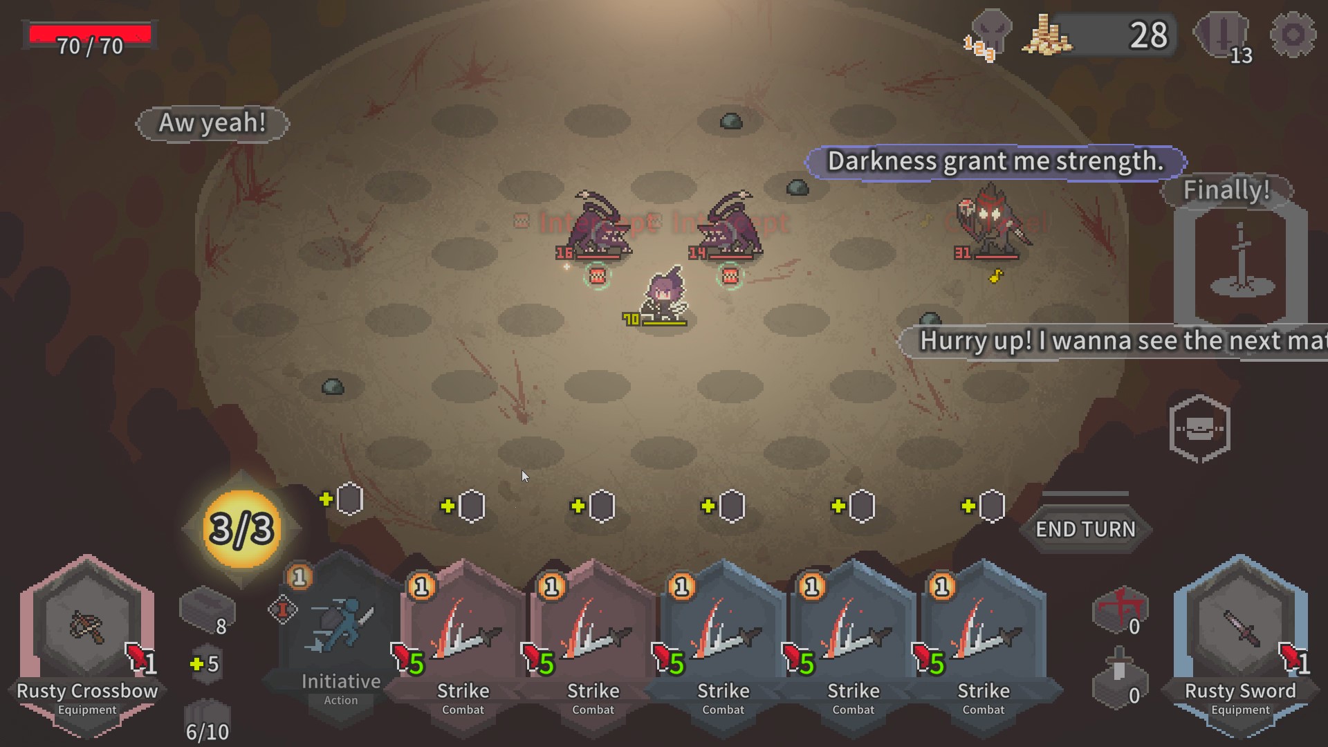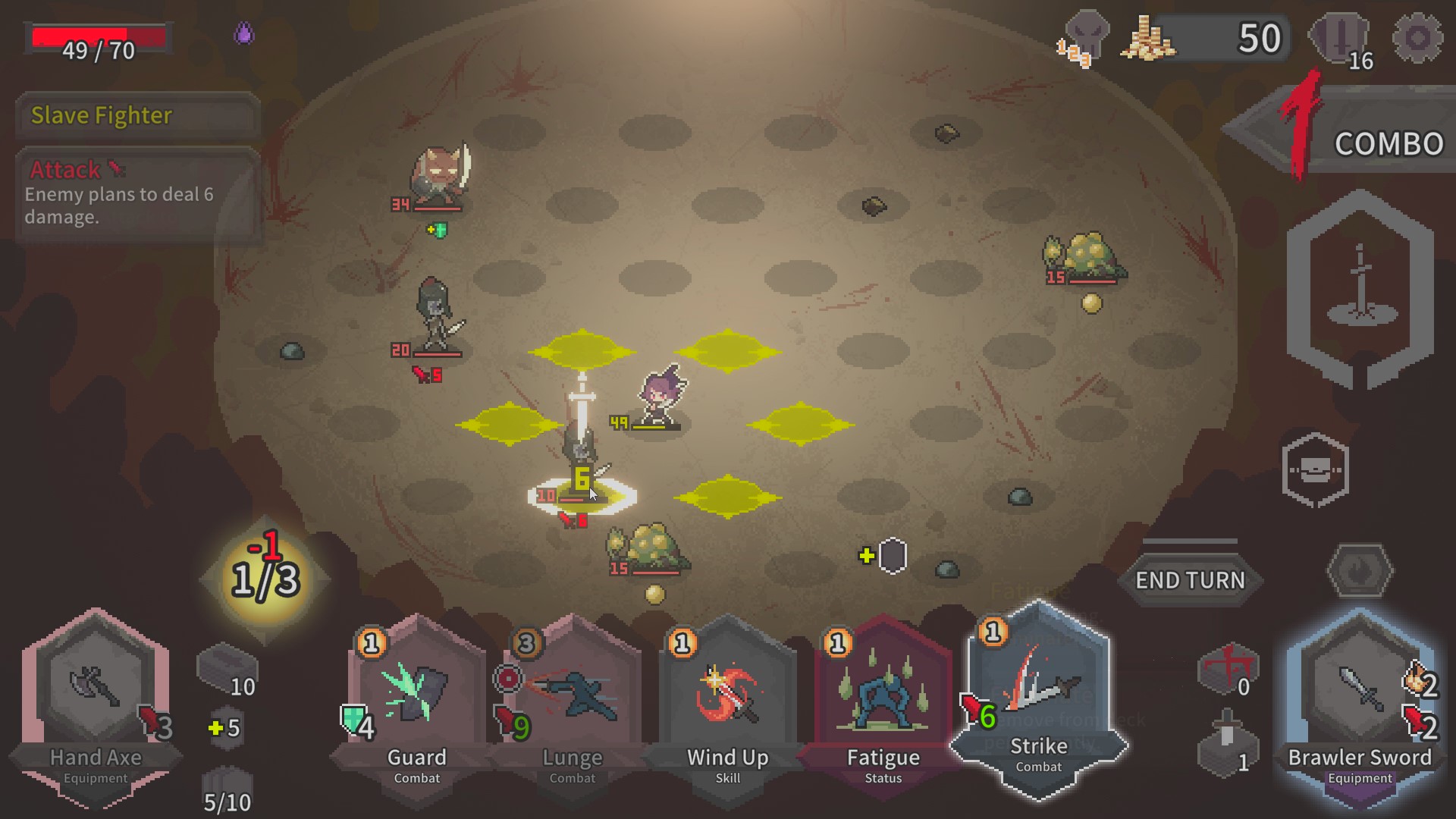 Alina is a deckbuilding game so a majority of the base mechanics are in the cards. Every turn the player draws a hand of five cards with the inclusion of one initiative card, for movement. Basic cards like strike and guard are prevalent for the first few fight, and as you climb the ladder and meditate, more cards will be offered to you.
