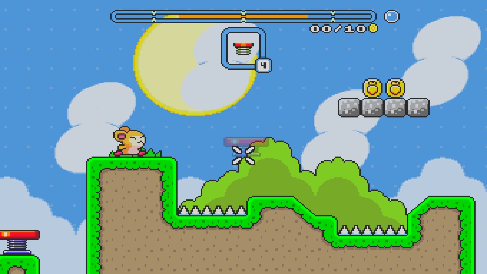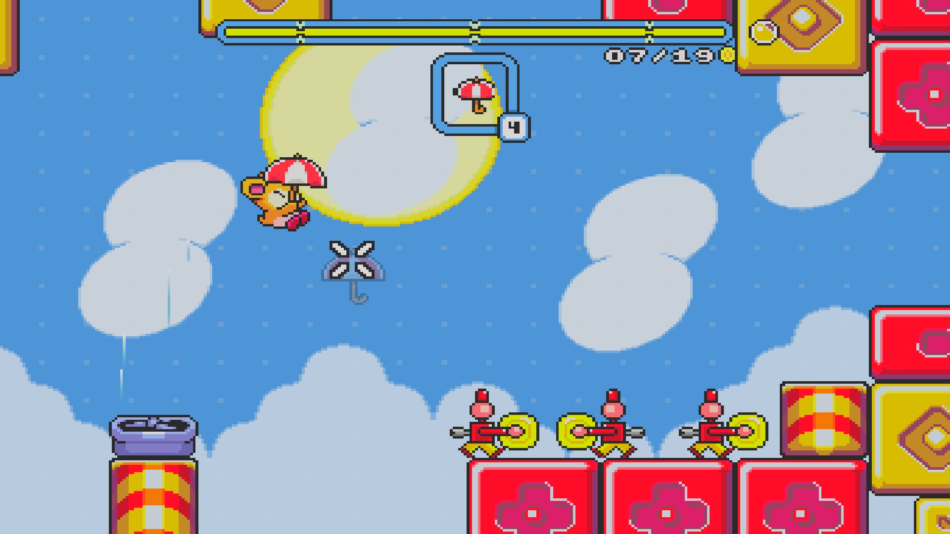 Pompom moves on his won without the player and the player takes the role of “bridge-builder” so that Pompom can achieve their goal. As Pompom walks to the right there are bubbles with various building materials that the player can utilize so that Pompom can get to their objective. Long and small horizontal blocks, right triangle blocks, balloons umbrellas, and springs that look like they were ripped right from a Sonic game are at your disposal within the demo. It all may seem simple but it really does work out really well, because you have essentially an infinite play area, you can force Pompom to take any route that you want. You can also use Pompom offensively or defensively, it really is all up to the player, which is a nice freedom to have.