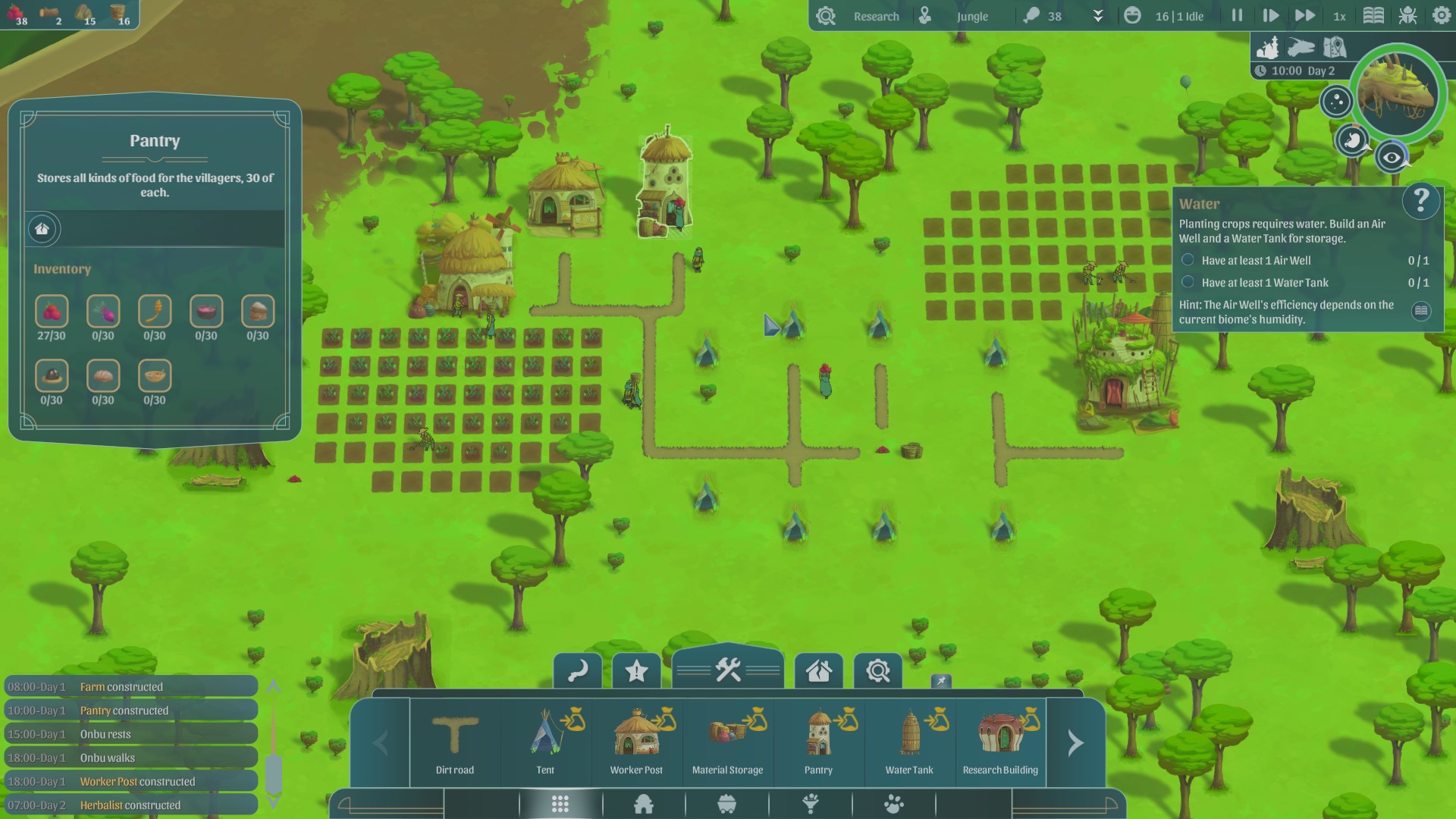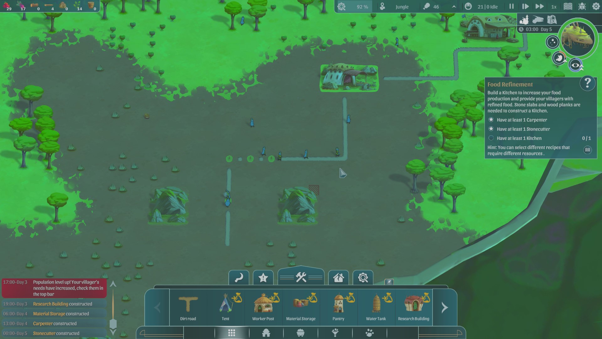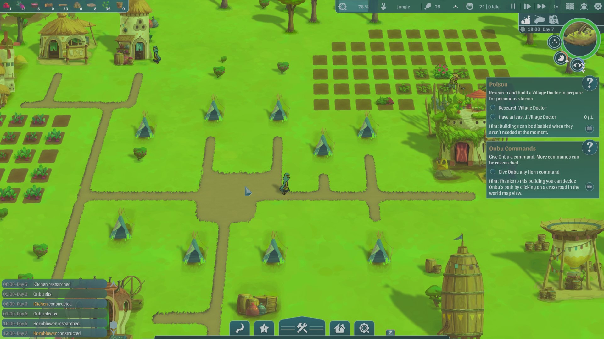 The Wandering Village is your standard management sim. You have some survivors and they need food and shelter. Navigate some of them to chop down trees, smash some rocks and collect berries to distribute amongst each other. Then, once you have enough resources, build homes, a kitchen, and a farm for the survivors. Rinse and repeat and during the demo, you can get all the way to researching shaman huts for healing and a horn to command Onbu.