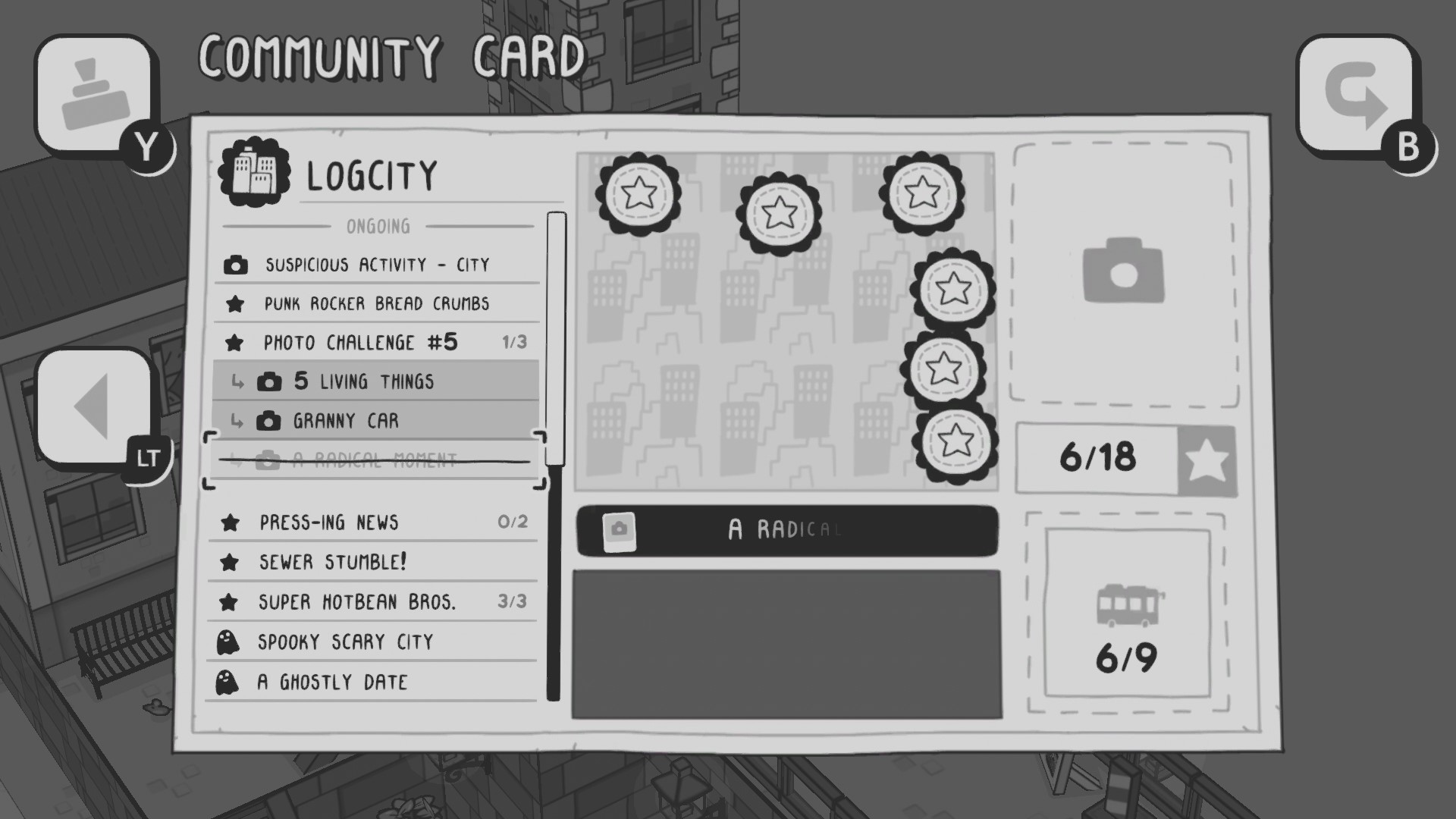 In order to progress to the next area, you will need to achieve a certain amount of stamps on your bus card. Stamps are given out after you complete the wide array of quests that are given to the player. Finding a cat hanging on a phone line, doing specific challenges from Photo Challenge givers, reuniting a family of balloons, and finding a very secret forest rave, all reward the player with stamps. There is so much to do in each section that if the player does in fact get stuck on something, there is most certainly something else to take the player’s focus away. It all works extremely well.