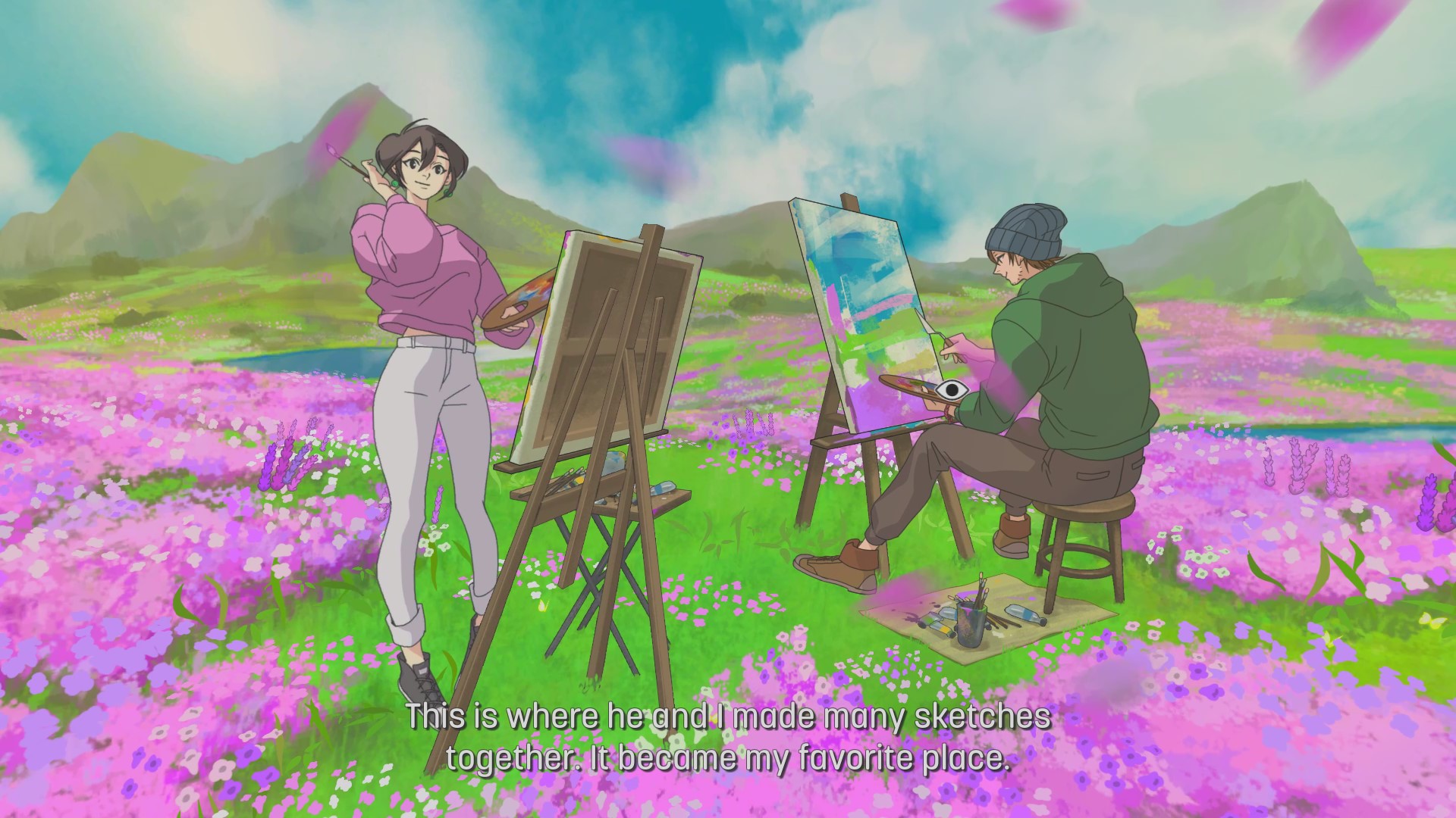 Art direction is fantastic. Beautiful hand-drawn backgrounds and animations really sell the game. So many bright colors and beautiful vistas that capture the imagination. There is a point where the young woman has a memory that involves sketching out in the field and that field is fucking amazing looking.