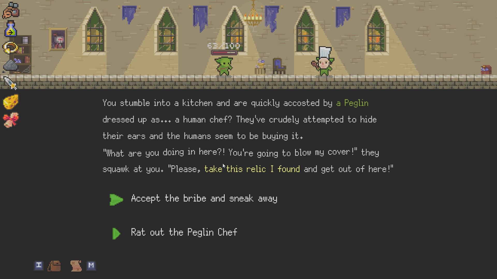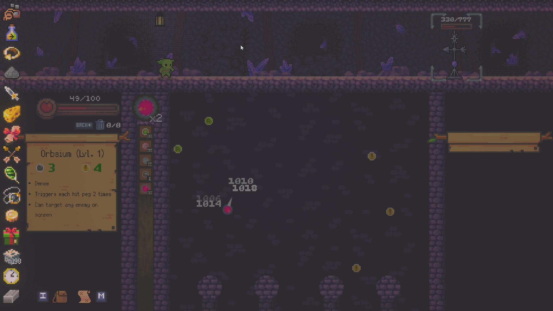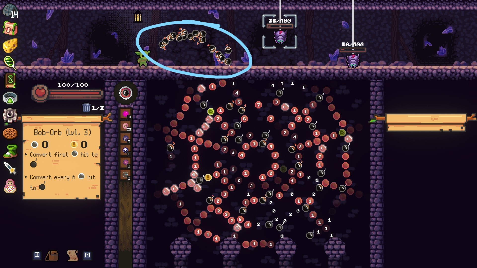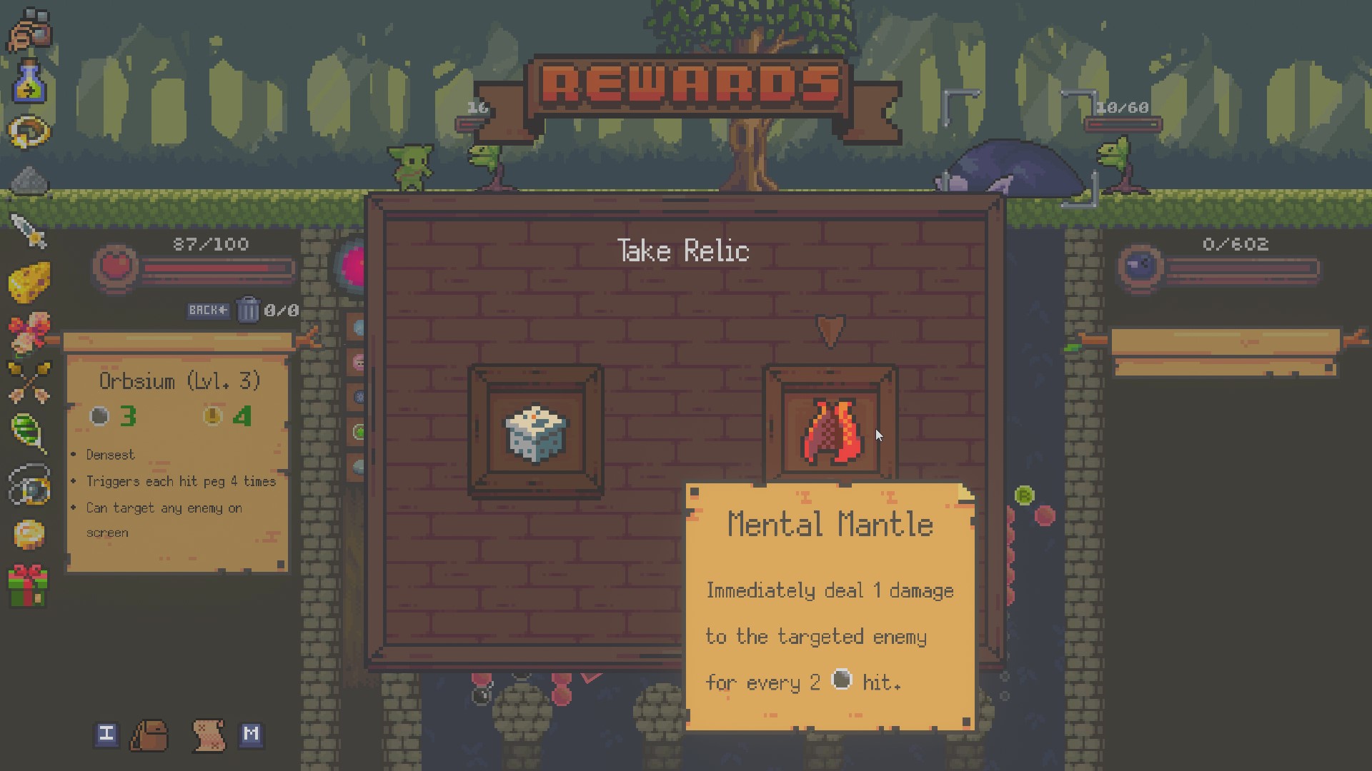 Along with new additions of orbs, there are a bunch of items that make their way into Peglin. Health restore, 2x the bombs, refreshes, and crits, 2x the balls but reduced damage, and even the ability to shoot the small ball twice. Items are rewarded to the player after mini-boss and boss battles and at question marks on the map on occasion.