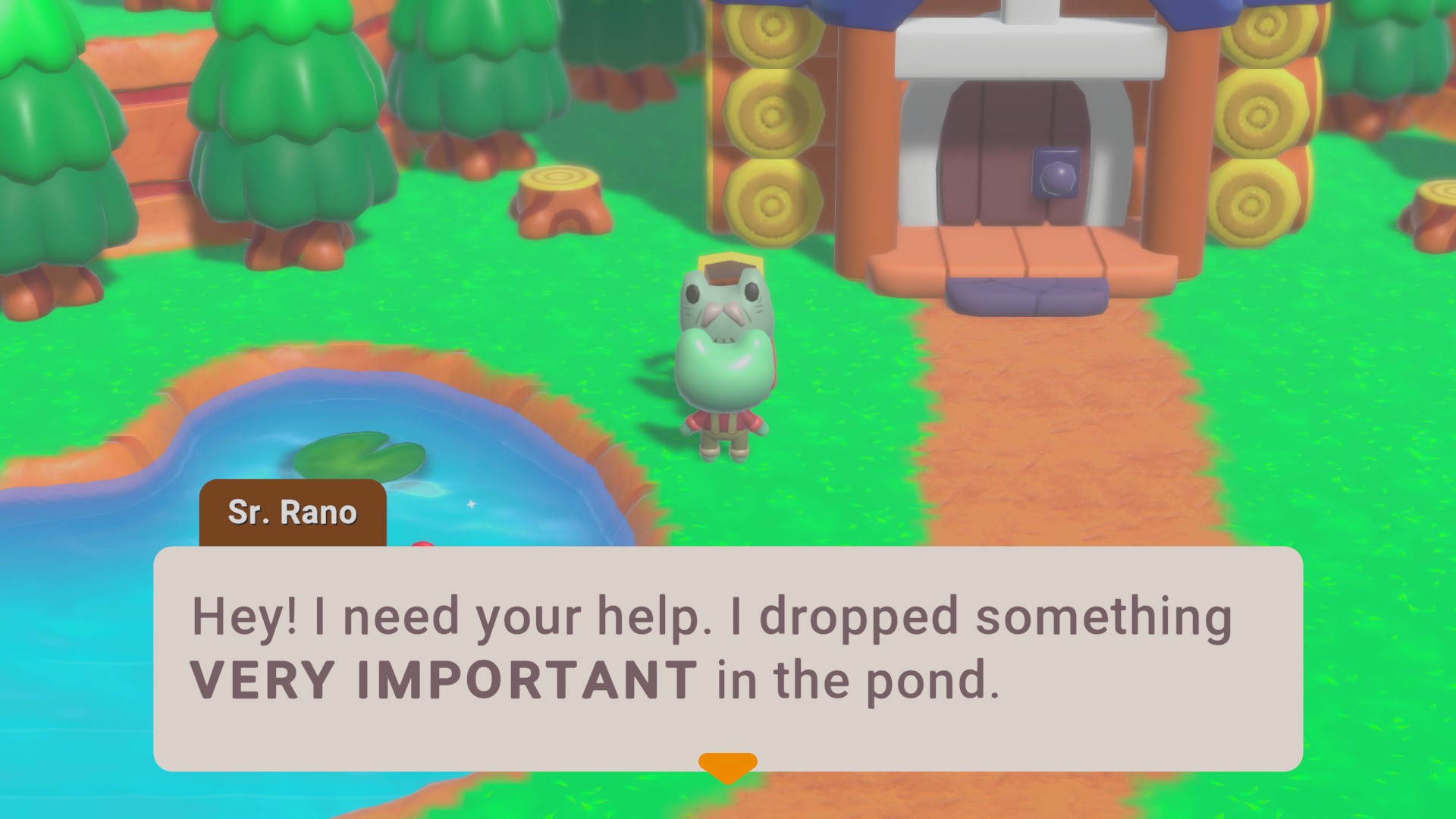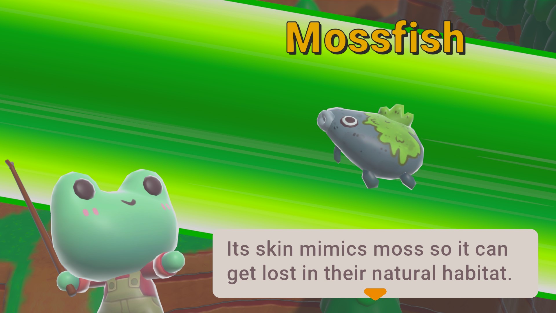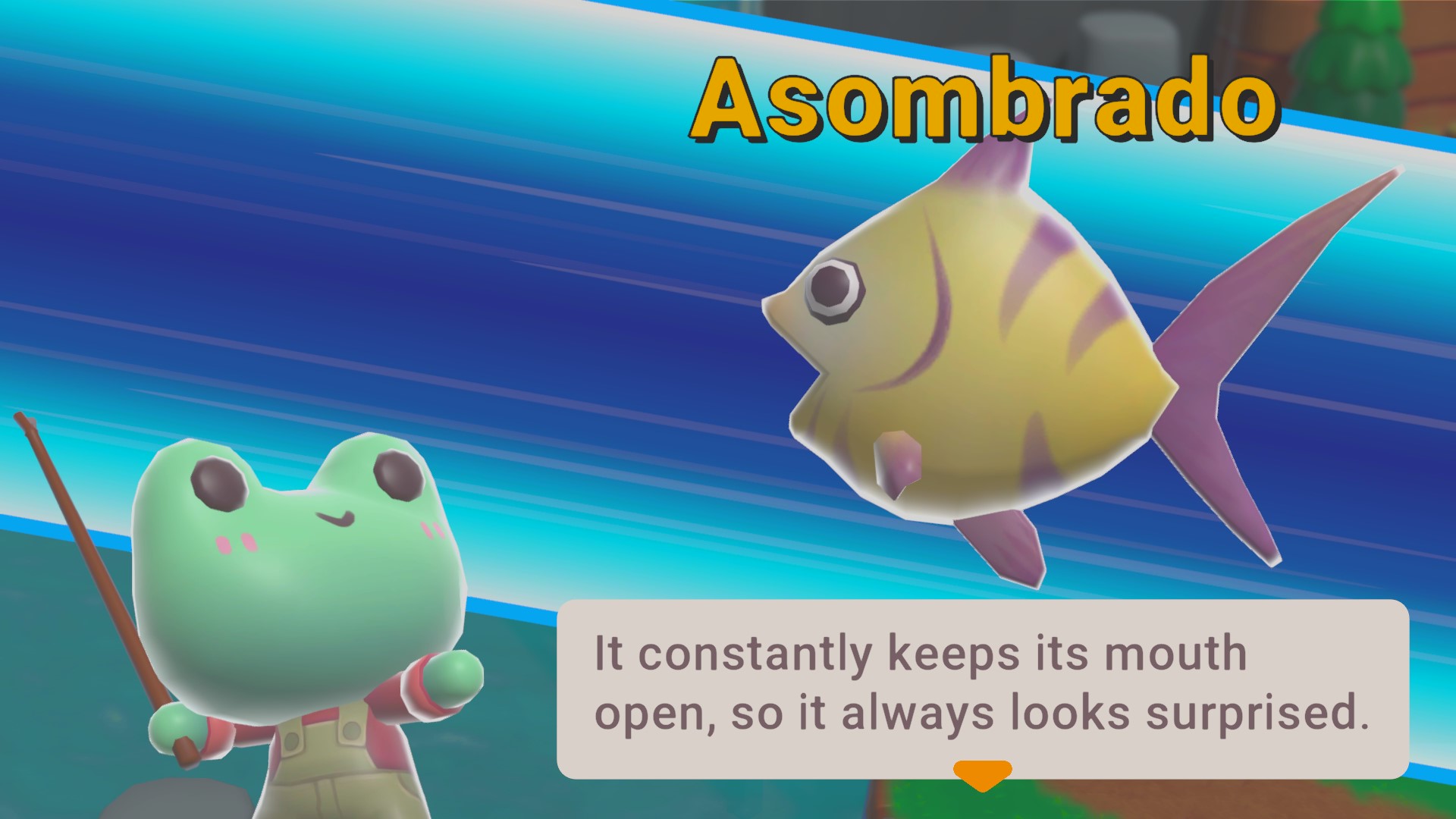 Ranita Fishing reminds me a lot of Animal Crossing. From the text and how items are picked up to the world itself. Very colorful and cute. The fishing mechanic is something that reminds me the most of Animal Crossing. Take out the rod, throw the line out towards the shadows that resemble fish, wait, then when an exclamation mark pops up above your head, REEL IT IN.